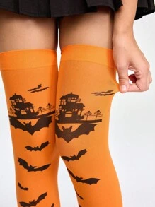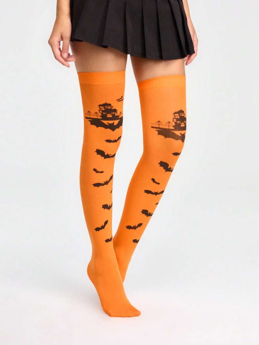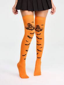 Grunge Punk جوارب طويلة فوق الركبة للنساء بطبعة خفافيش للهالوين