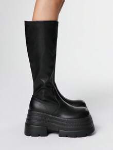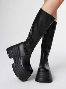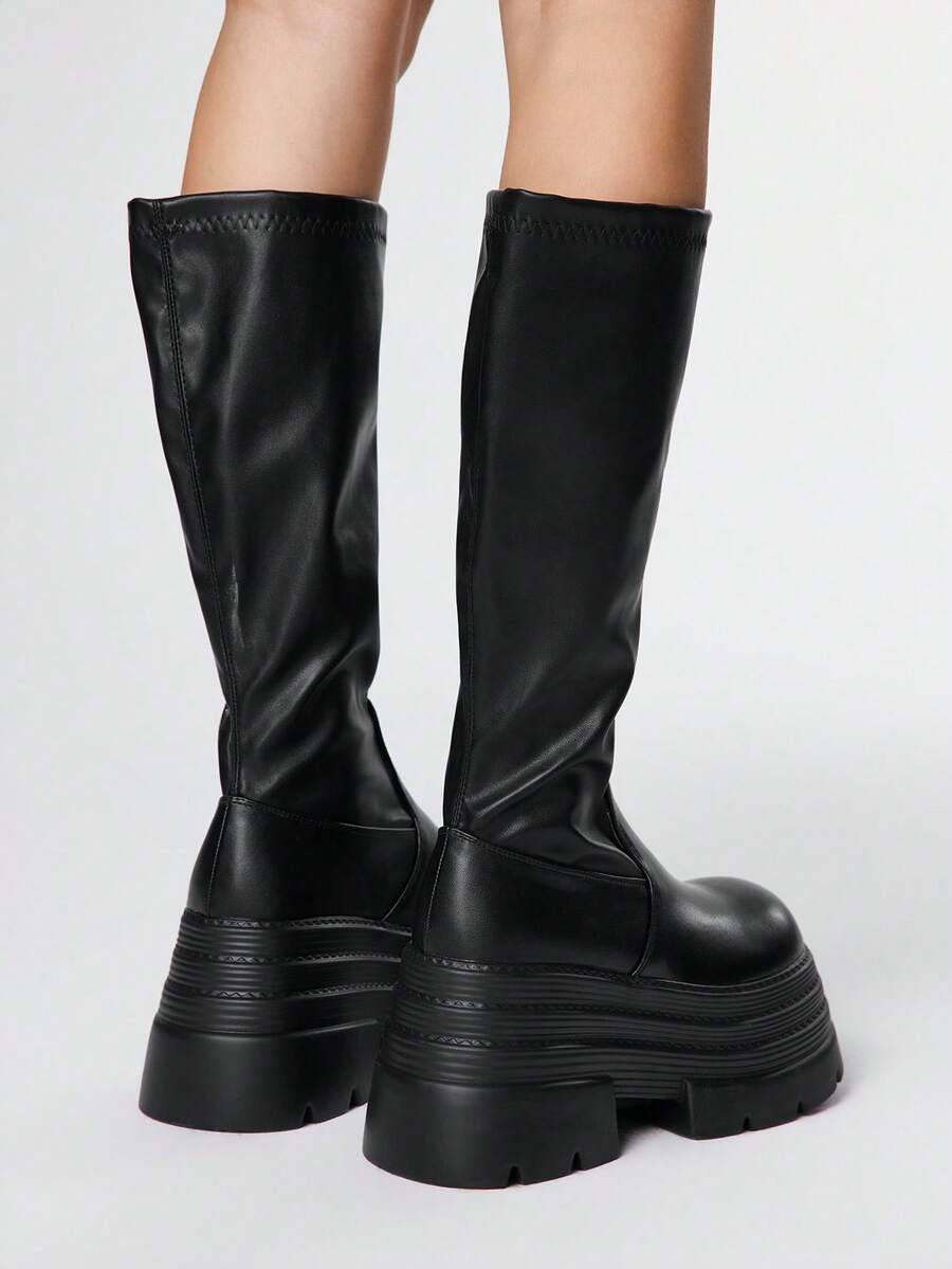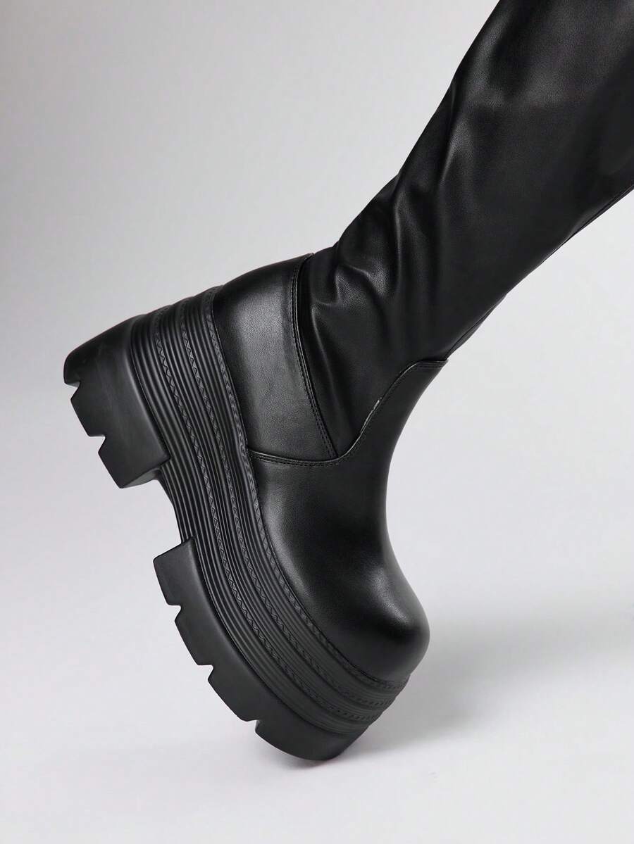 Grunge Punk بوت نسائية ذات طبقات متعددة وكعب منصة مدبب، من الجلد الأسود، طراز بانك جديد للخريف/الشتاء، للاستخدام اليومي في الشارع والحرم الجامعي وفوق الركبة