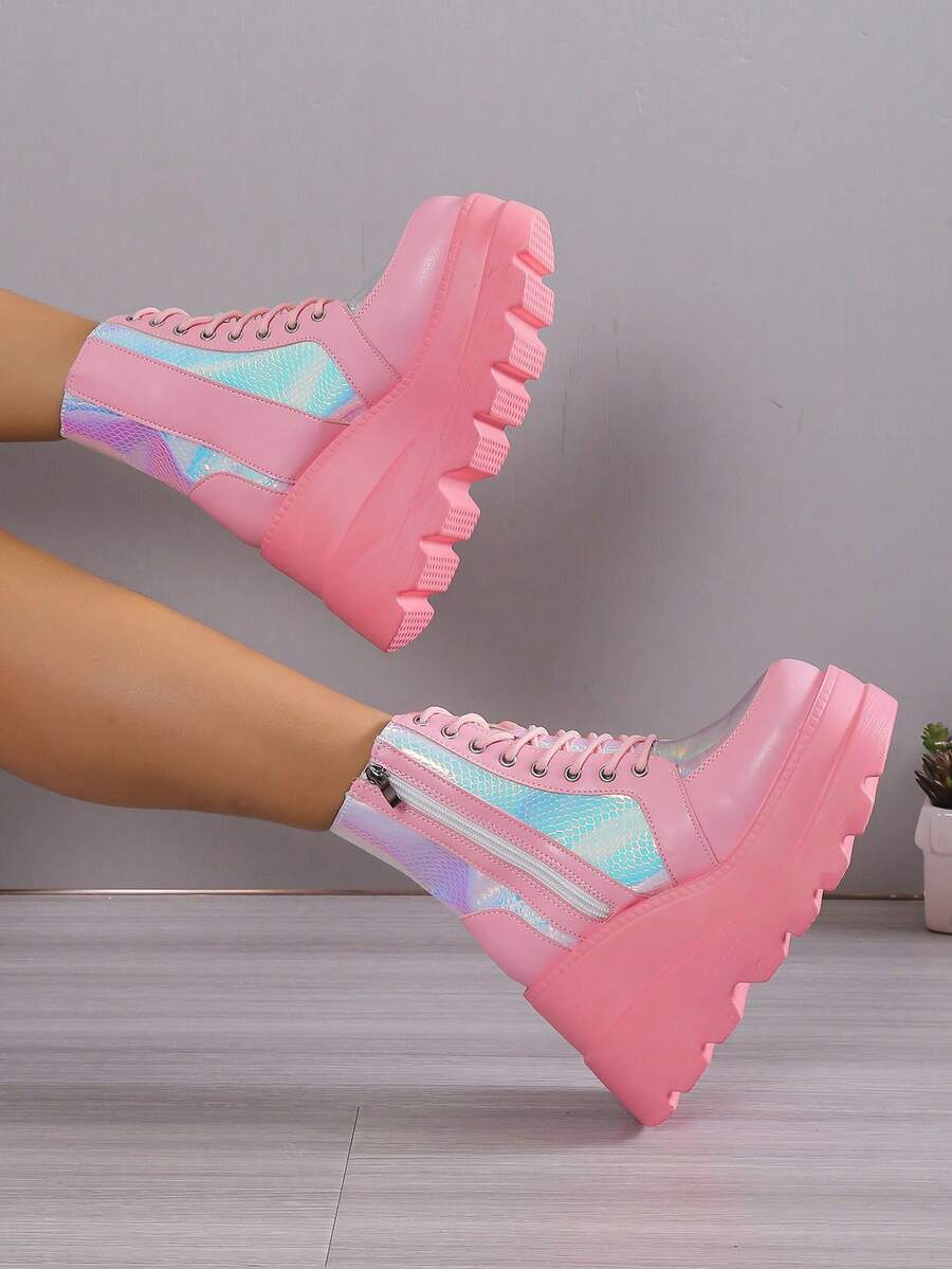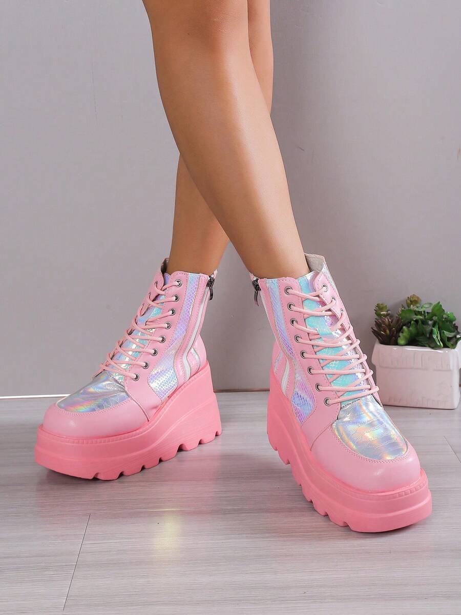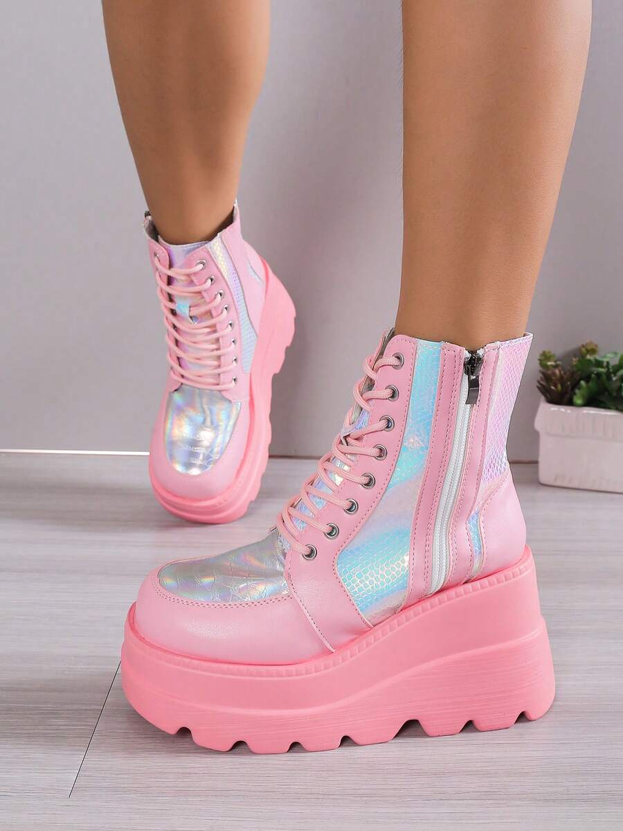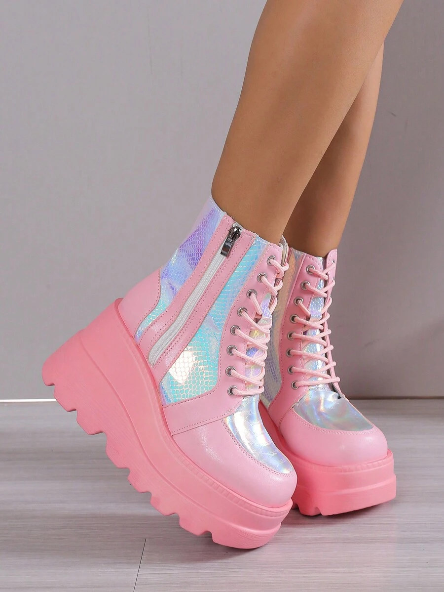 Grunge Punk جزمة برقبة طويلة للنساء سحاب جانبي كعب منحدر كعب منصة