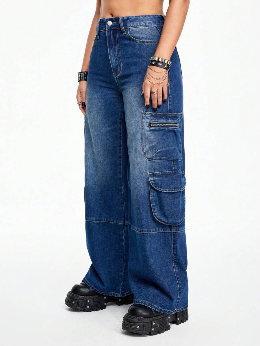 Grunge Punk بناطيل جينز كاجوال بجيوب متعددة بسيطة للنساء، للارتداء اليومي
