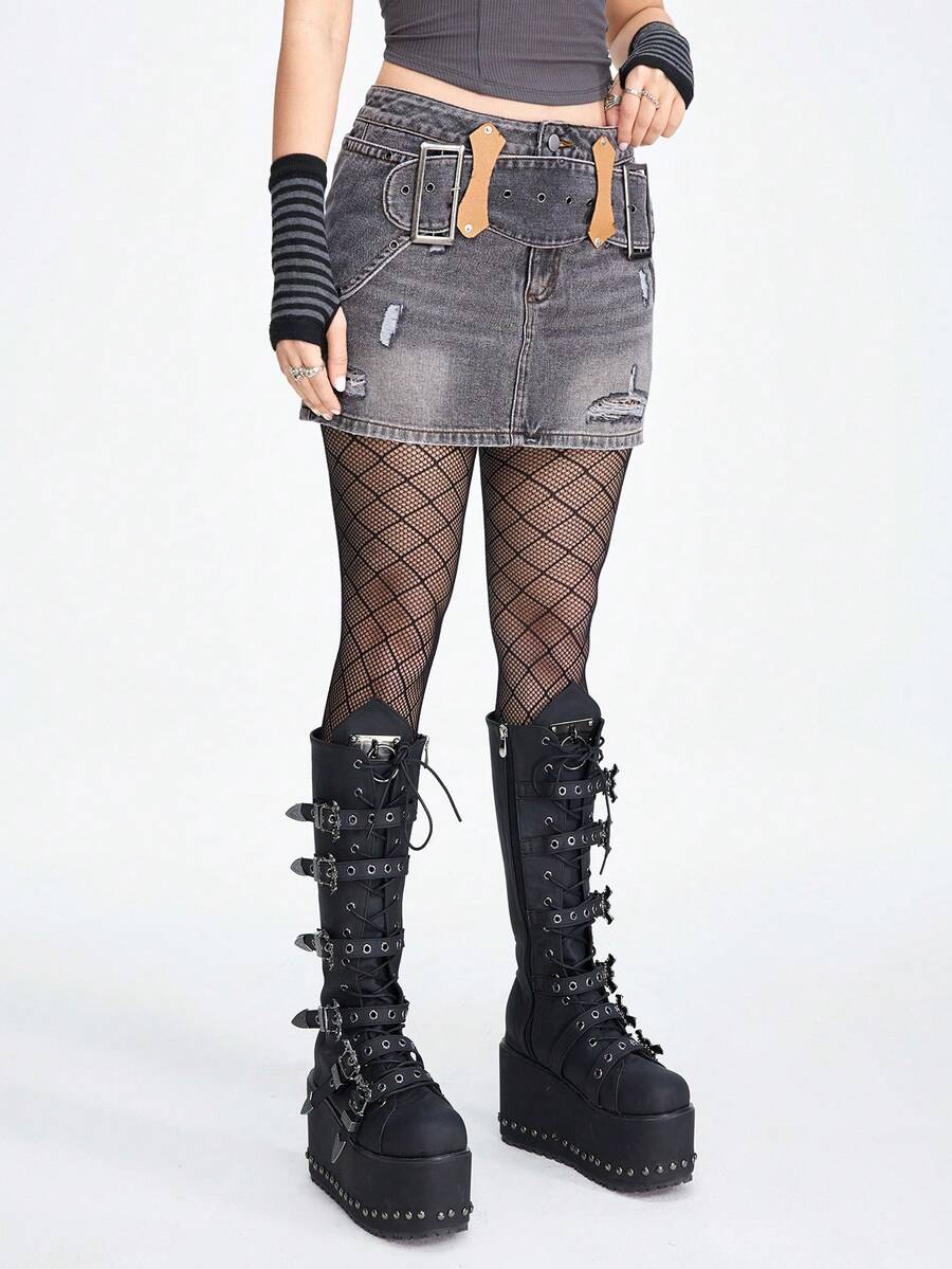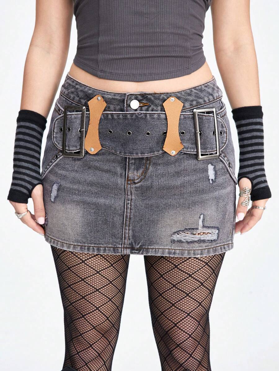 Grunge Punk تنورة جينز مستقيمة مهترئة للمرأة الصيفية