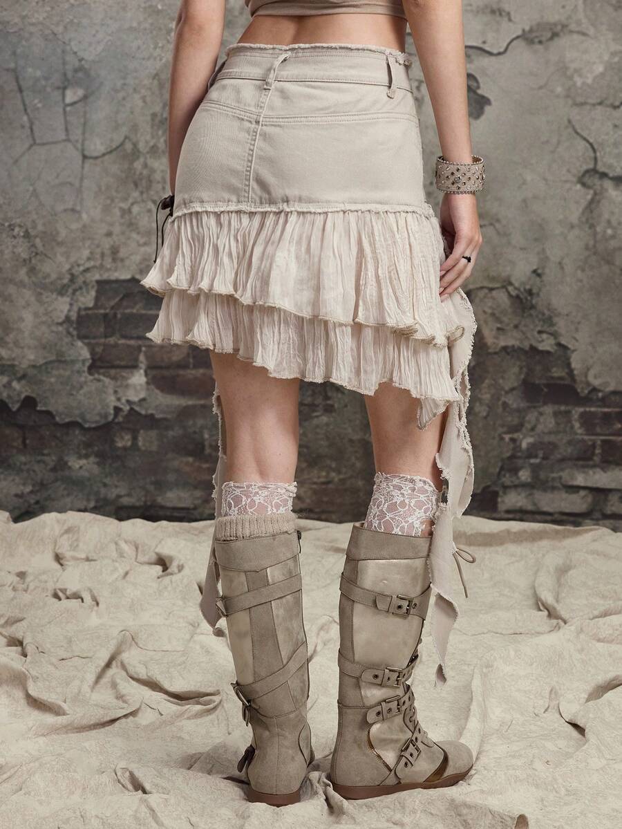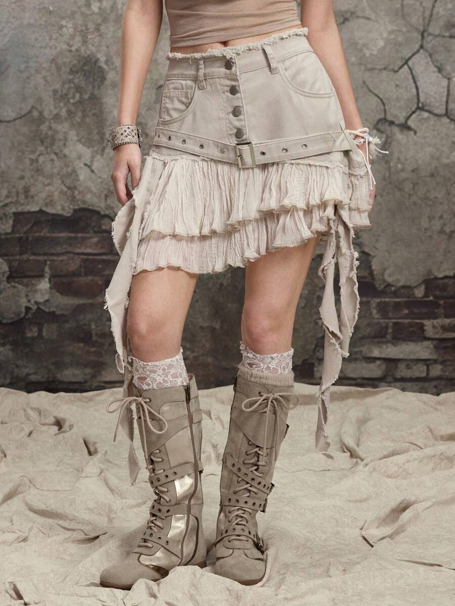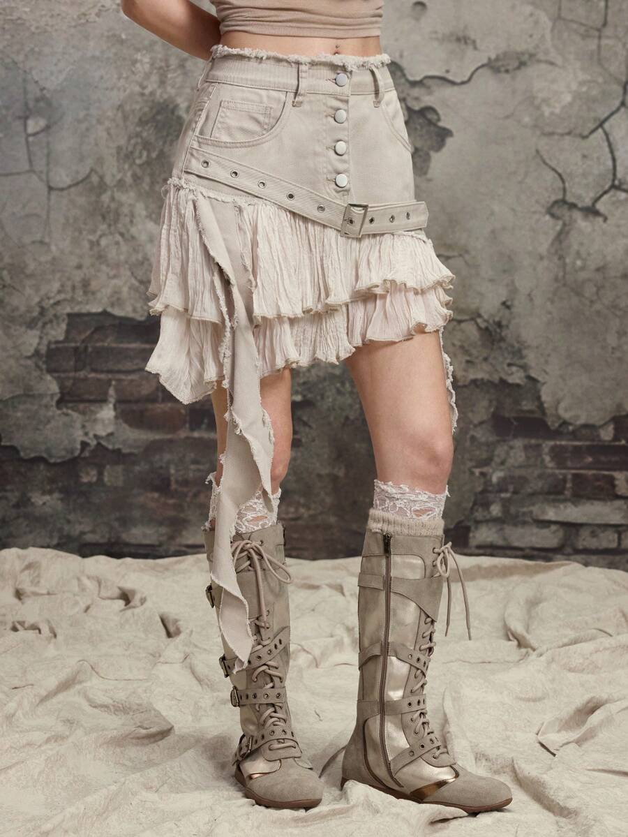 Grunge Punk تنورة ميني جينز نسائية مصممة بلمسات متداعية وكشكشة ونقشات وصفيحات
