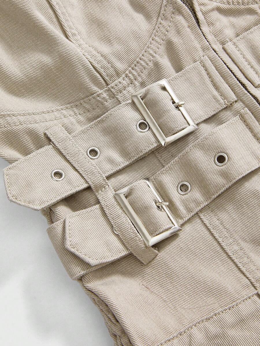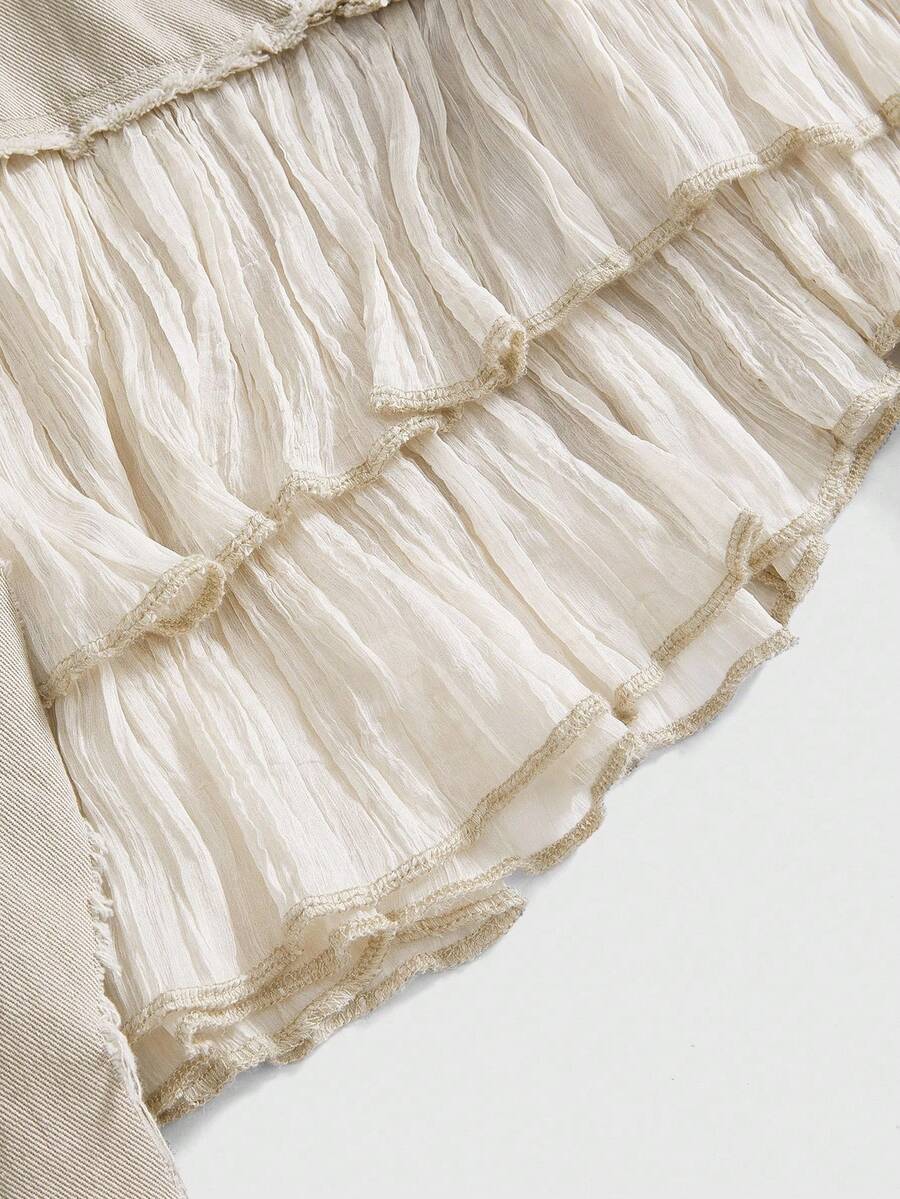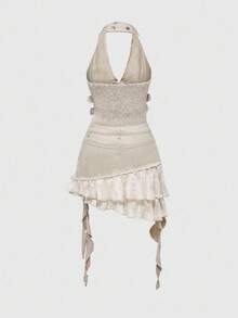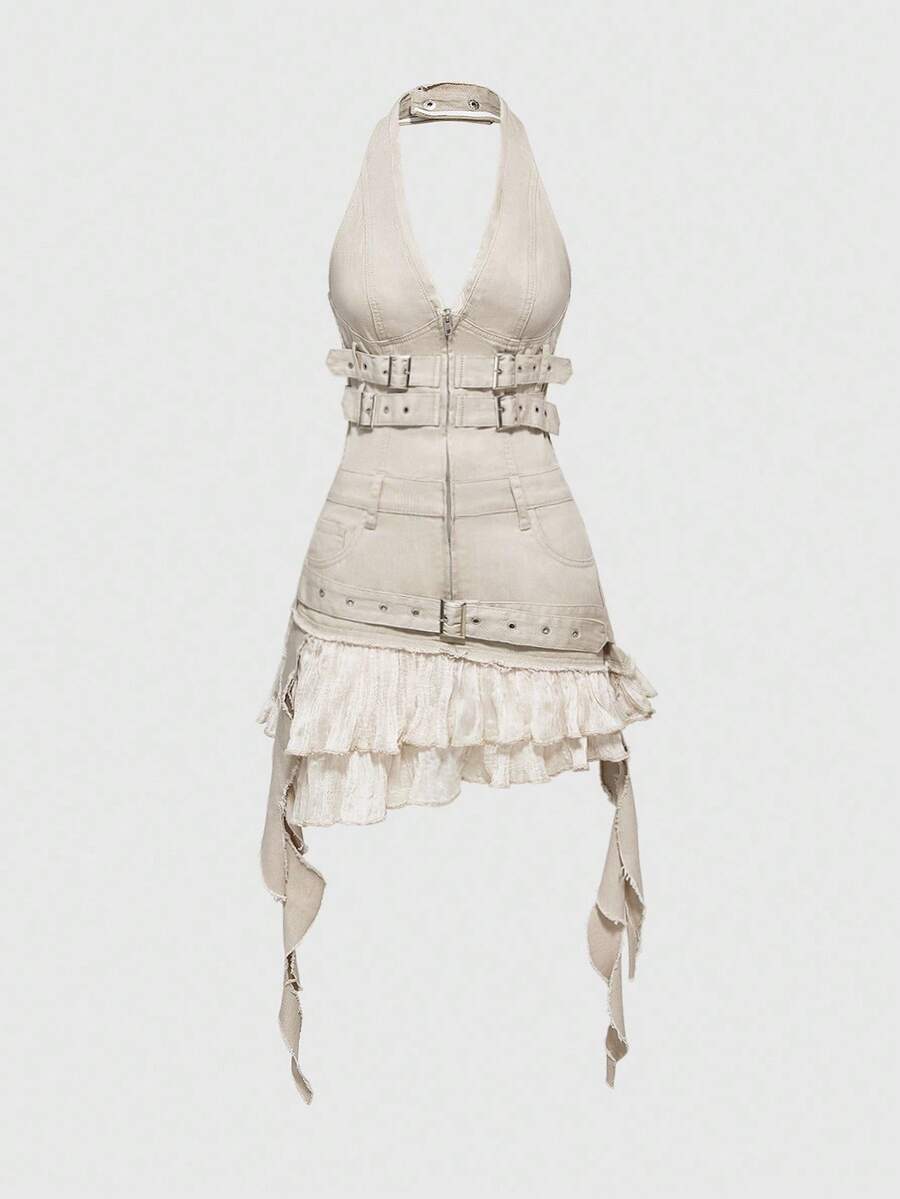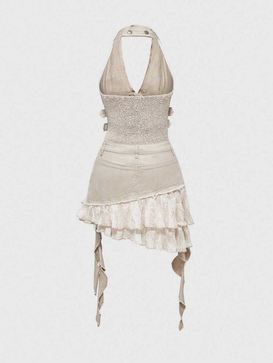 Grunge Punk فستان جينز نسائي بياقة حلقة مشدود بتصميم مخطط ومزين بالكشكشة من طراز Y2K