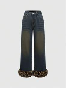 Grunge Punk بنطال جينز واسع الساق مغسول بشكل قديم بنمط فهد متقطّع نسيج فراء طراز Y2K