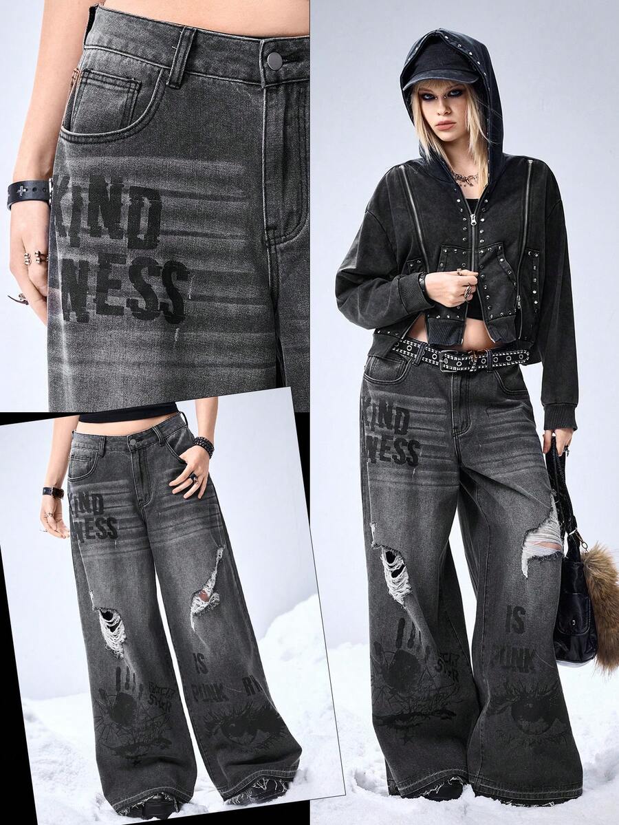 Grunge Punk جينز نسائي بساق واسعة مطبوع عليه يد وعين وكوكب بطراز الشارع والبانك والغرافيتي من طراز Y2K