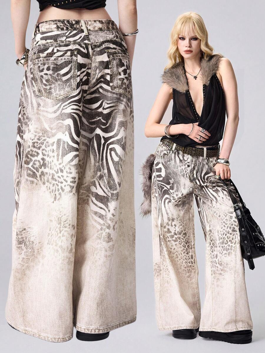 Grunge Punk بنطلون جينز ذو قصة مستقيمة وخصر منخفض بطبعات نمر وزيبرا باللونين الأسود والأبيض بطراز فينتاج Y2K