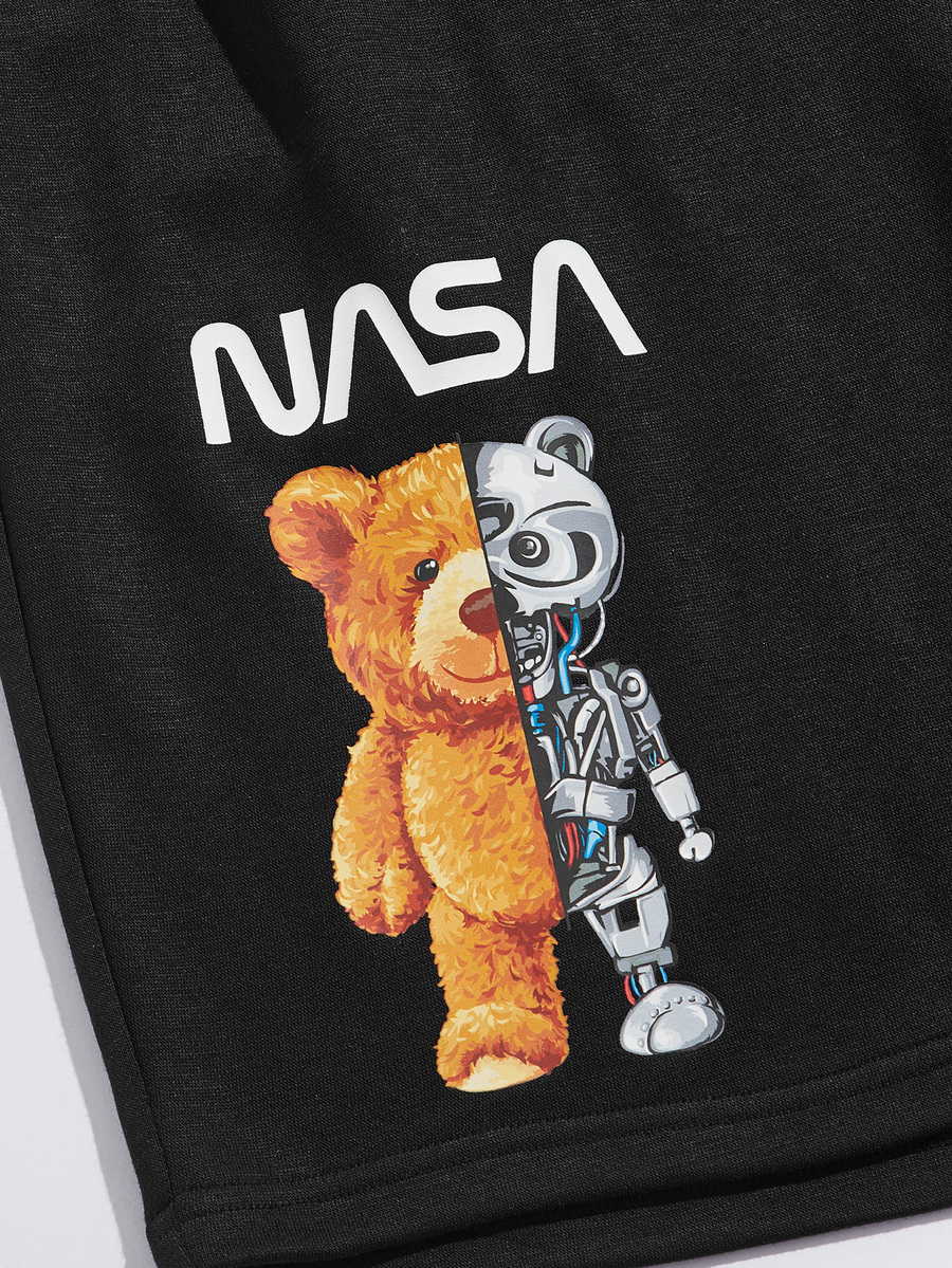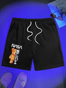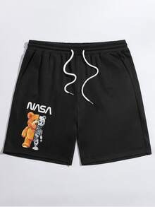 بنطلون قصير بجرافيك عبارة ودب رباط خصر للرجال