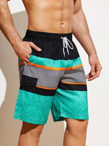 سروال قصير للسباحة مع تفاصيل الرباط والطباعة المخططة بلون مقسوم للرجال، شورتات عطلة الشاطئ