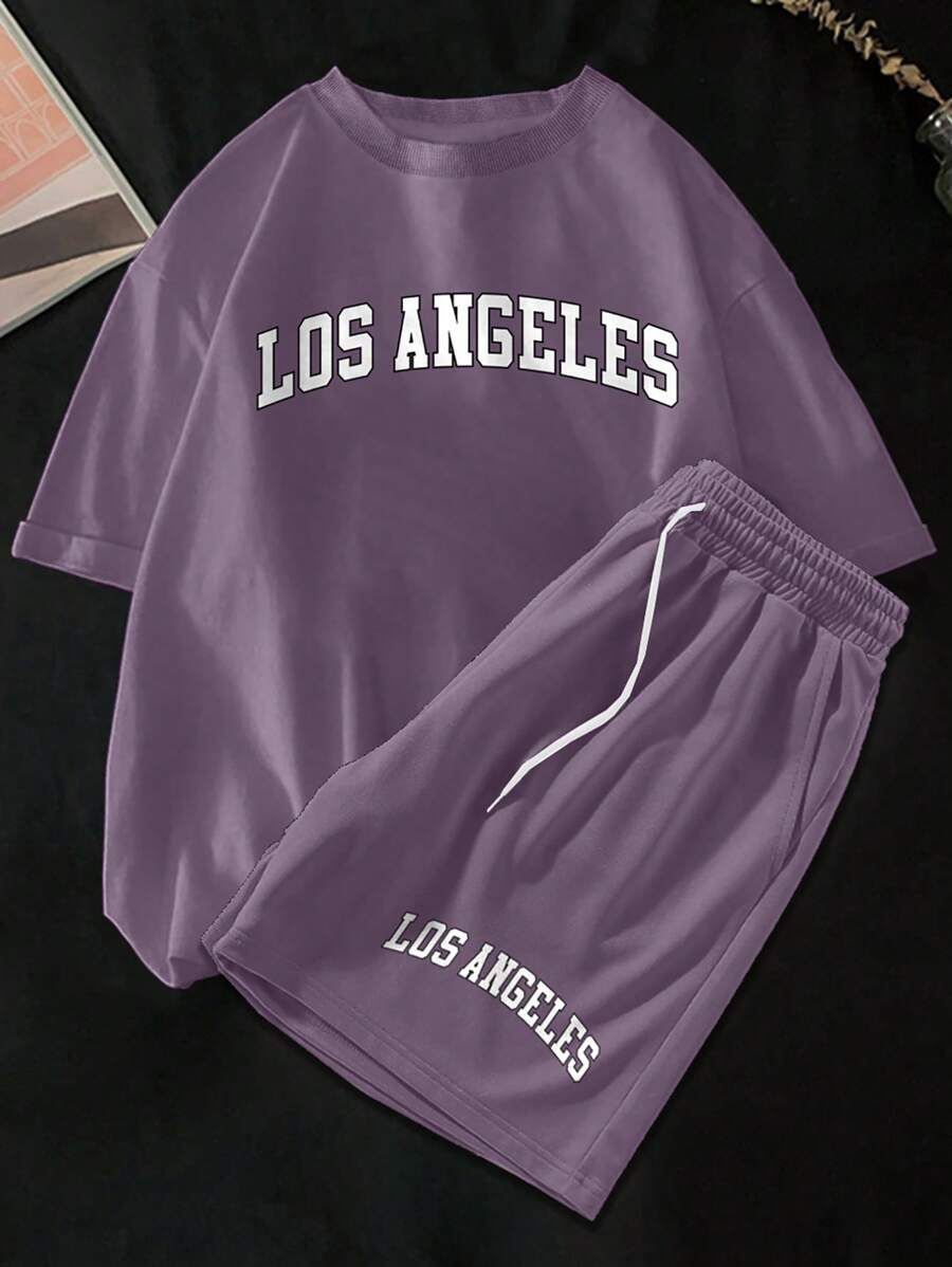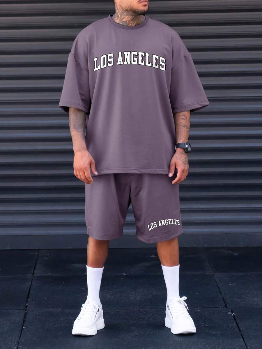 مجموعة تي شيرت رجالي فضفاض مع حروف غرافيك و شورت بخصر الرباط