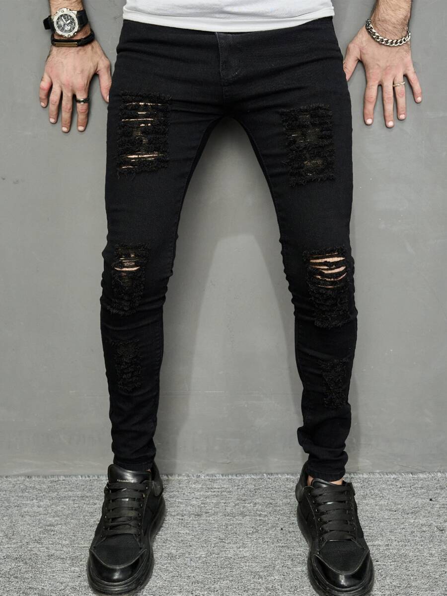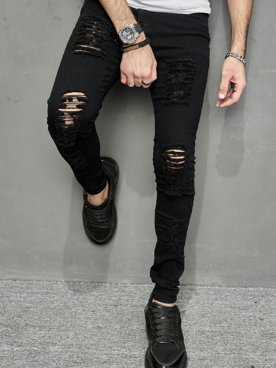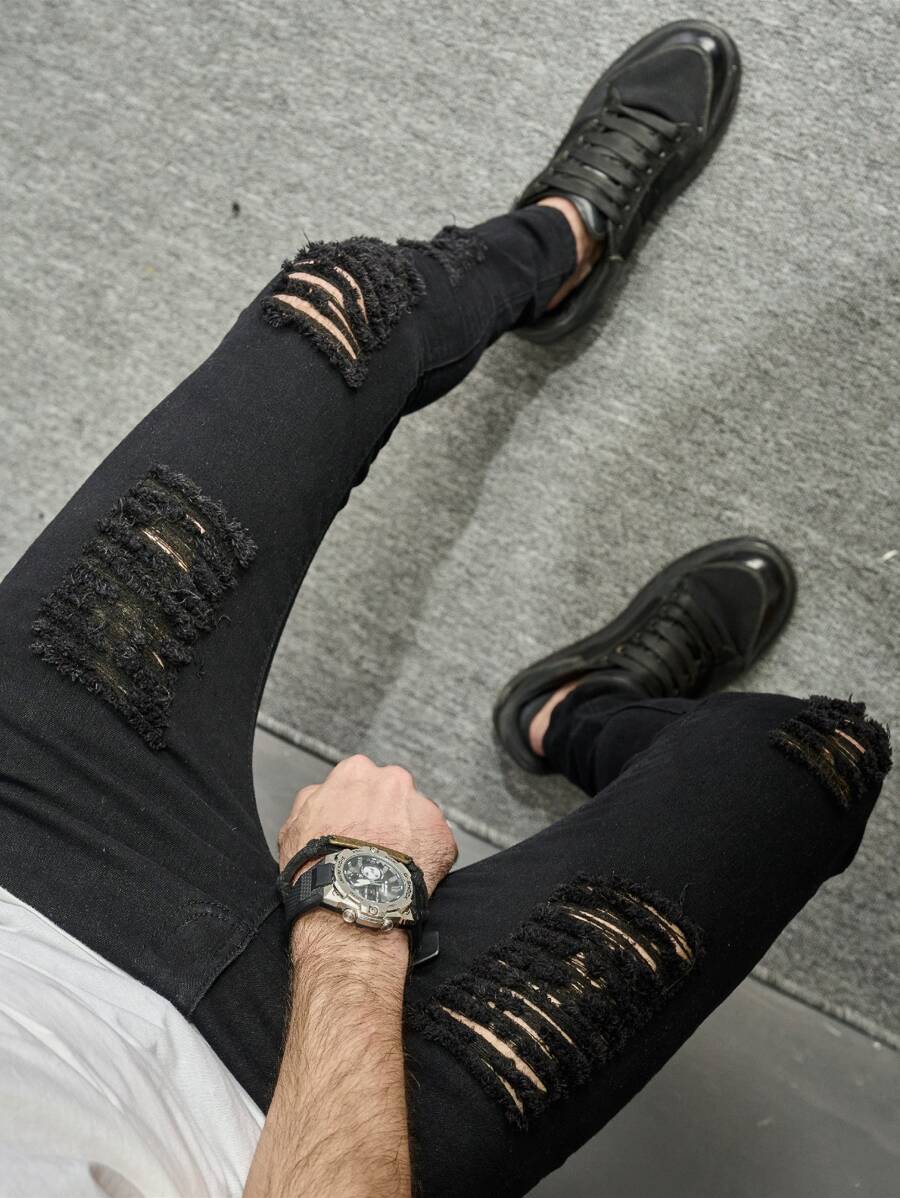 بنطال جينز رجالي قطن ممزق متصدع ، تركيب ضيق أسود سادة طويل لحمولة السراويل ، هدايا للزوج والحبيب