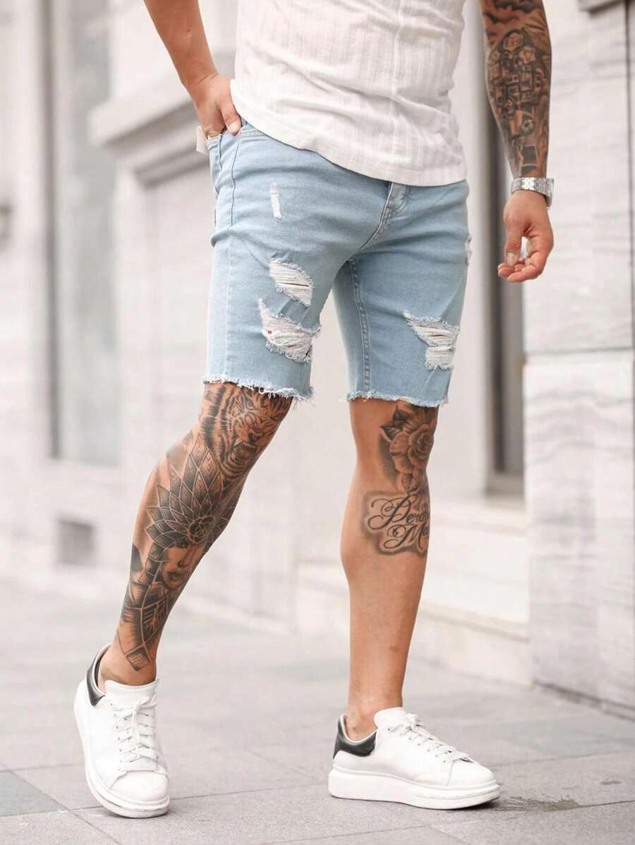 شورت جينز جورتس رجالي من القطن بطية خام ممزقة و خامة بلون أزرق فاتح عادية للعطلات بطابع عتيق