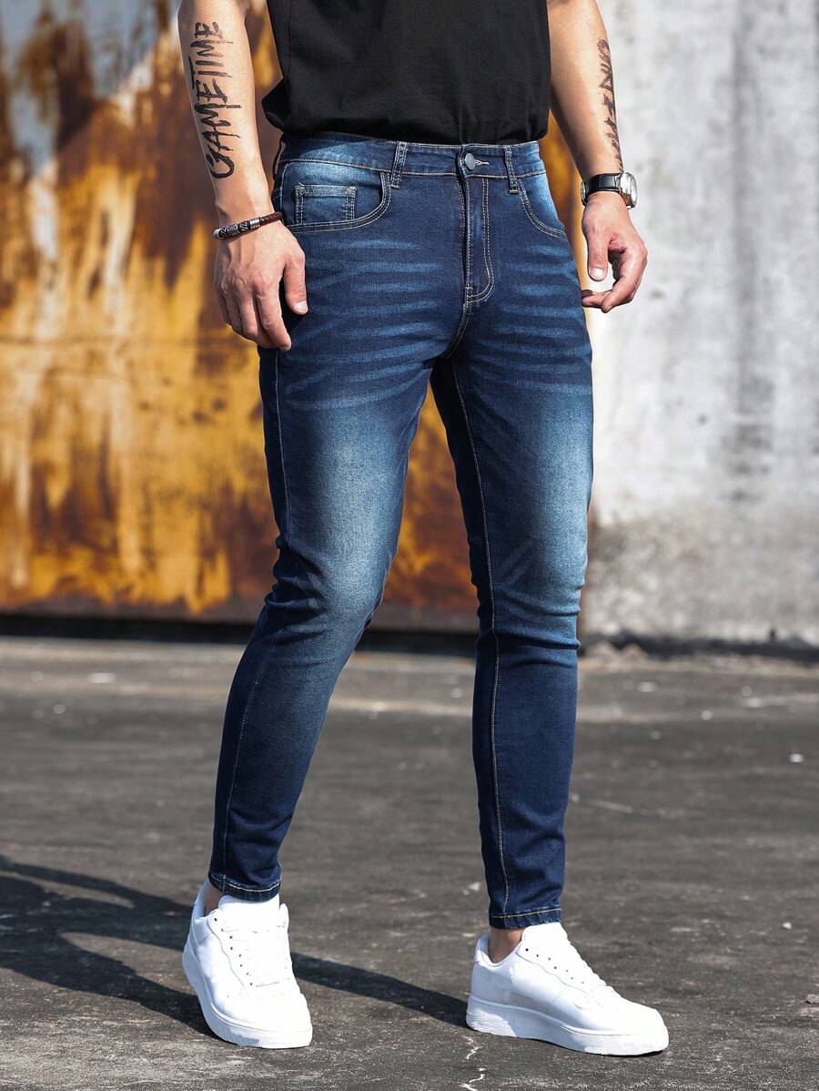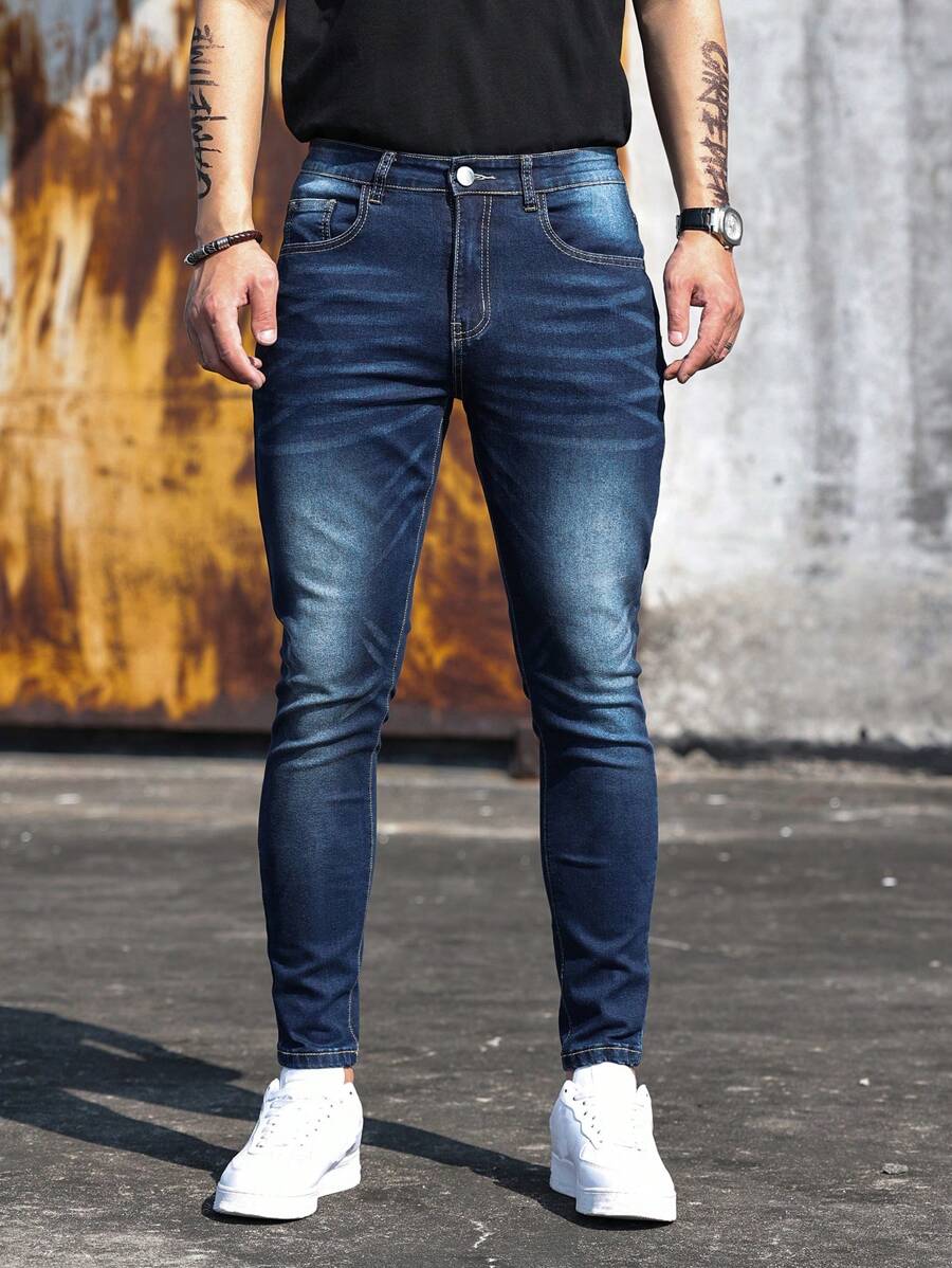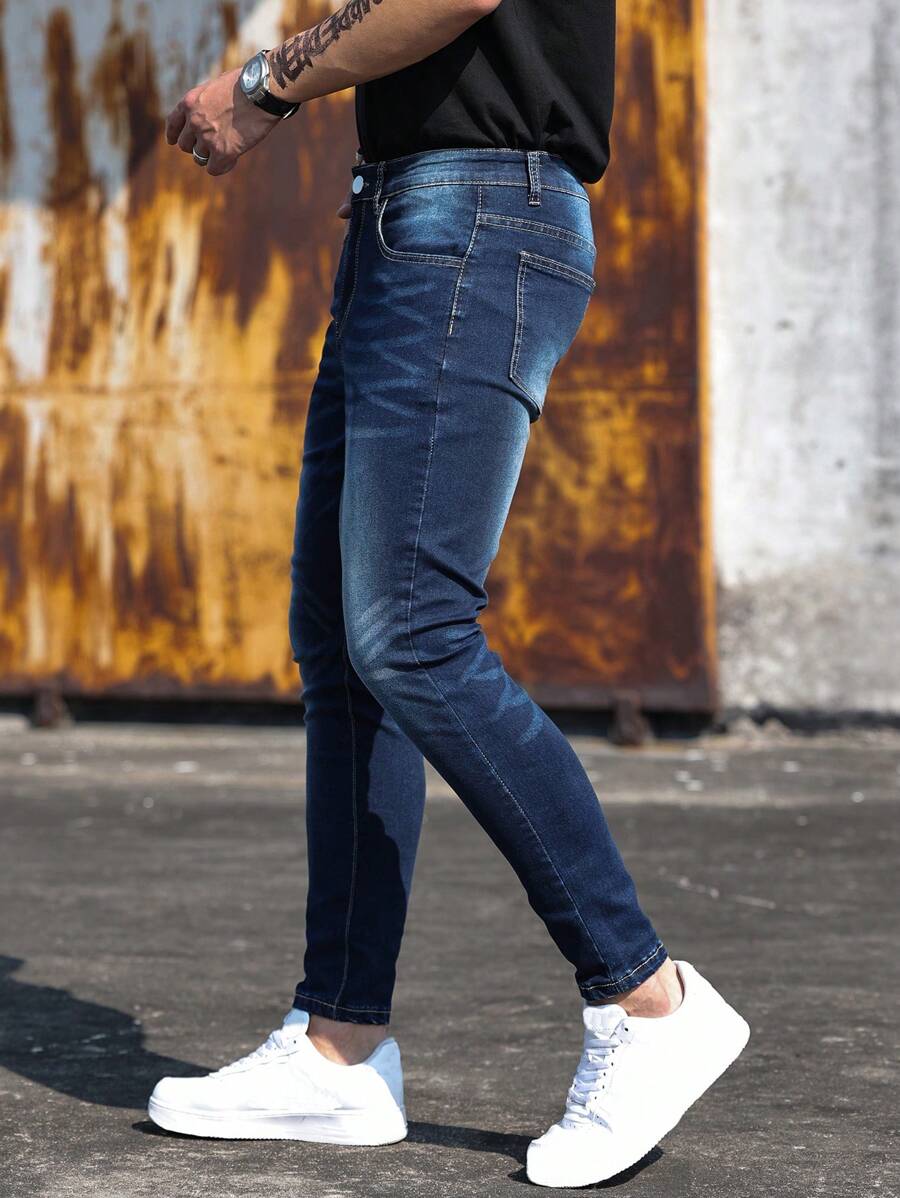 جينز بغسل داكن قطن بجيوب مائل ضيق بنمط عادي أزرق داكن ضيق للارجال, جينز كاربو مغسول, هدايا للزوج والحبيب