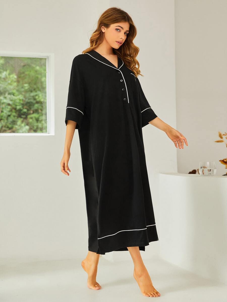 فستان نوم بأزرار نصفية وخطوط ملونة، فستان نوم مريح، خريف وشتاء