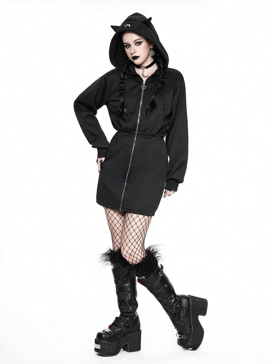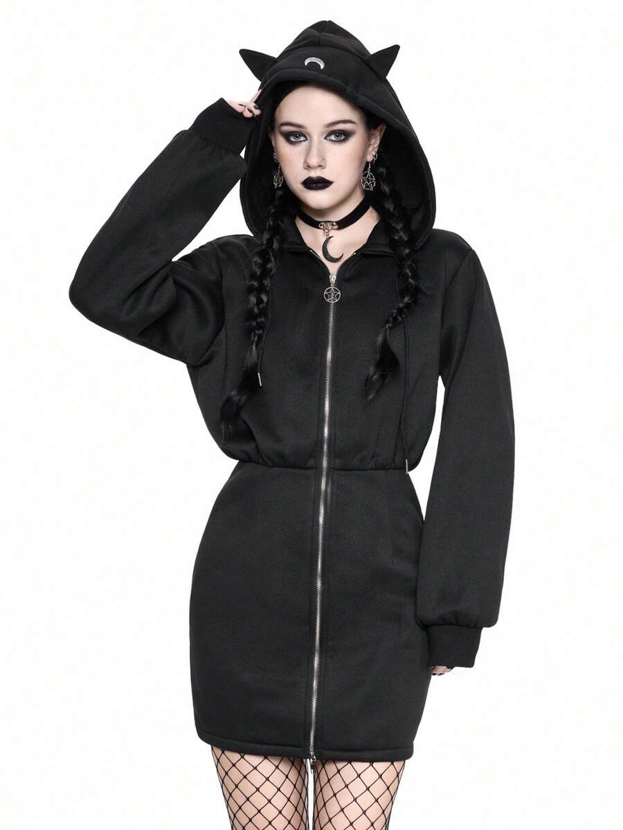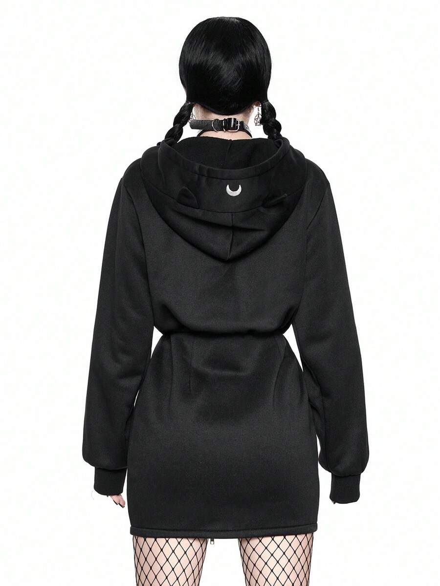 Goth هوديي مزود بسحاب مطرز بأذن القطة والقمر للنساء بطراز جوثيك