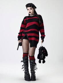 Goth كنزة صوفية كنزة مخططة كبيرة الحجم مهترئة بطراز بانك وجرانج وجوثيك وروك المتطرف، باللونين الأسود والأحمر