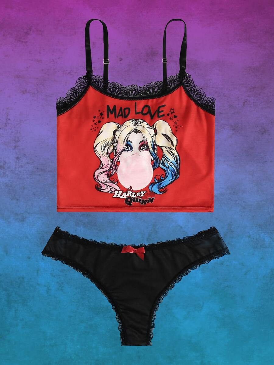 Harley Quinn | ROMWE طقم ملابس داخلية حرف بجرافيك شخصية رسوم كارتون دانتيل متباين اللون