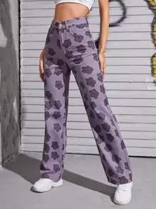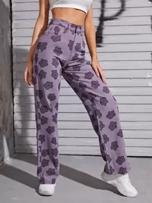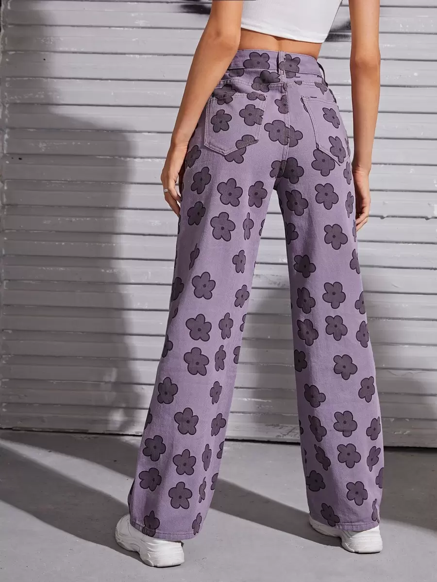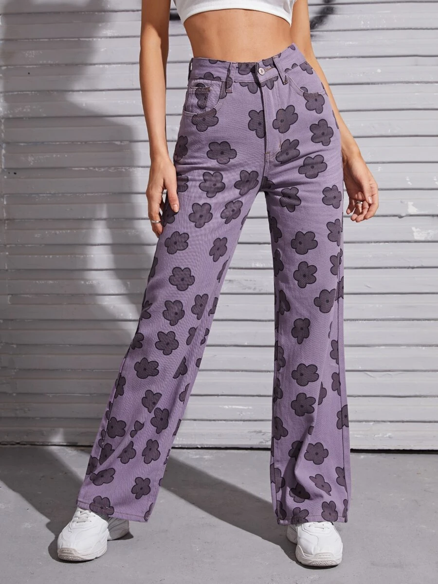 بنطلون جينز بجيب مائل وبطباعة زهر شامل بخصر عالي