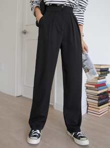 بنطلون ذو خصر عالي مطوي التفاصيل ذو ساق مستقيمة، بنطلون نسائي رسمي للعمل