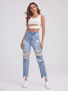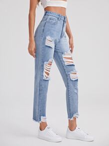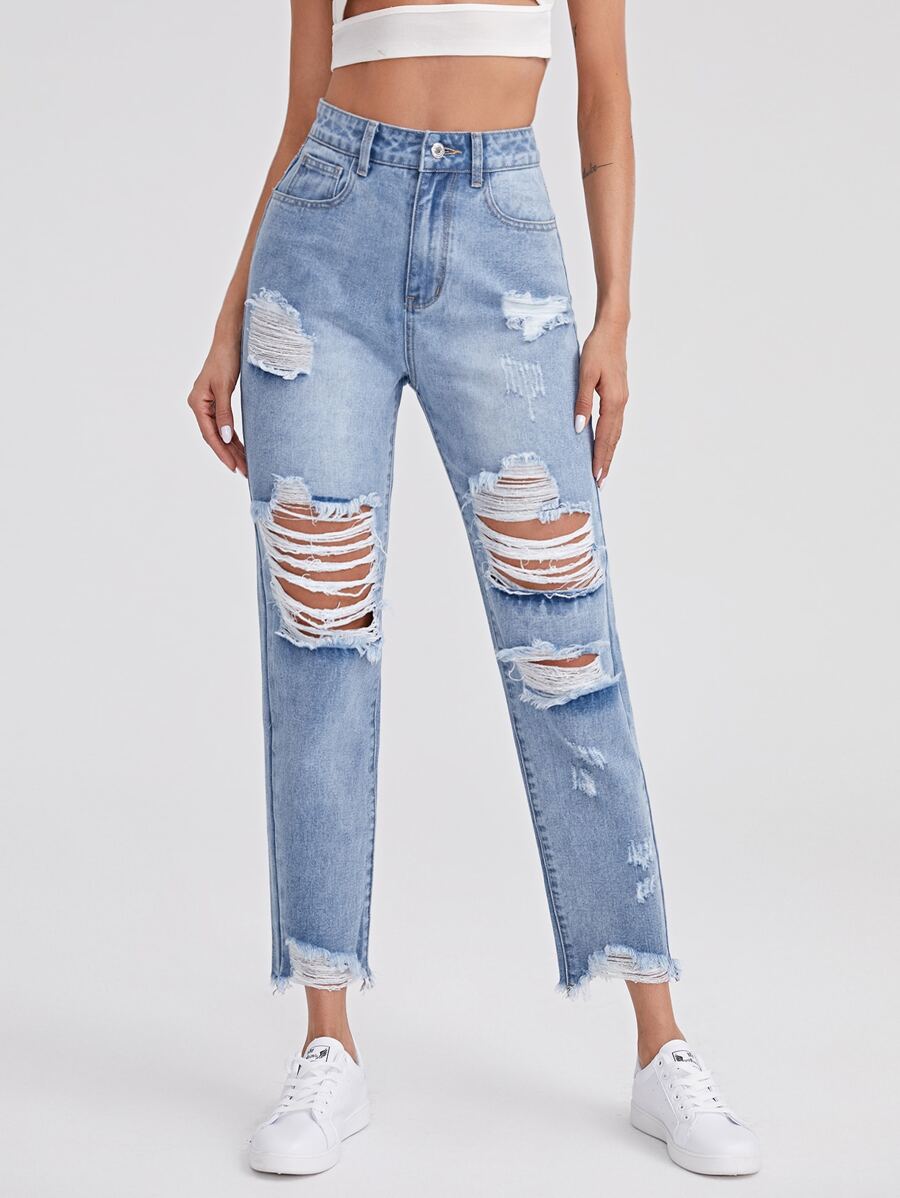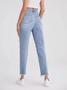 بنطون جينز بحافة خام ممزق بخصر عالي