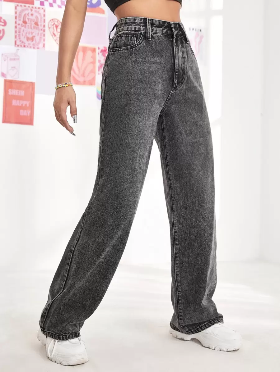 بنطلون جينز نسائي بخصر مرتفع وساق واسعة ، أزرار، جيوب ،سوستة، بنطلون جينز نسائي أسود فضفاض بخصر مرتفع وساق واسعة للربيع والخريف، للارتداء اليومي الكاجوال