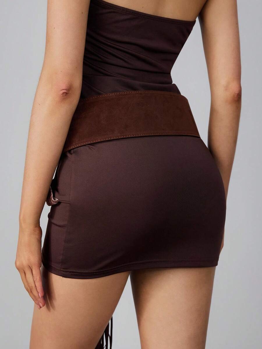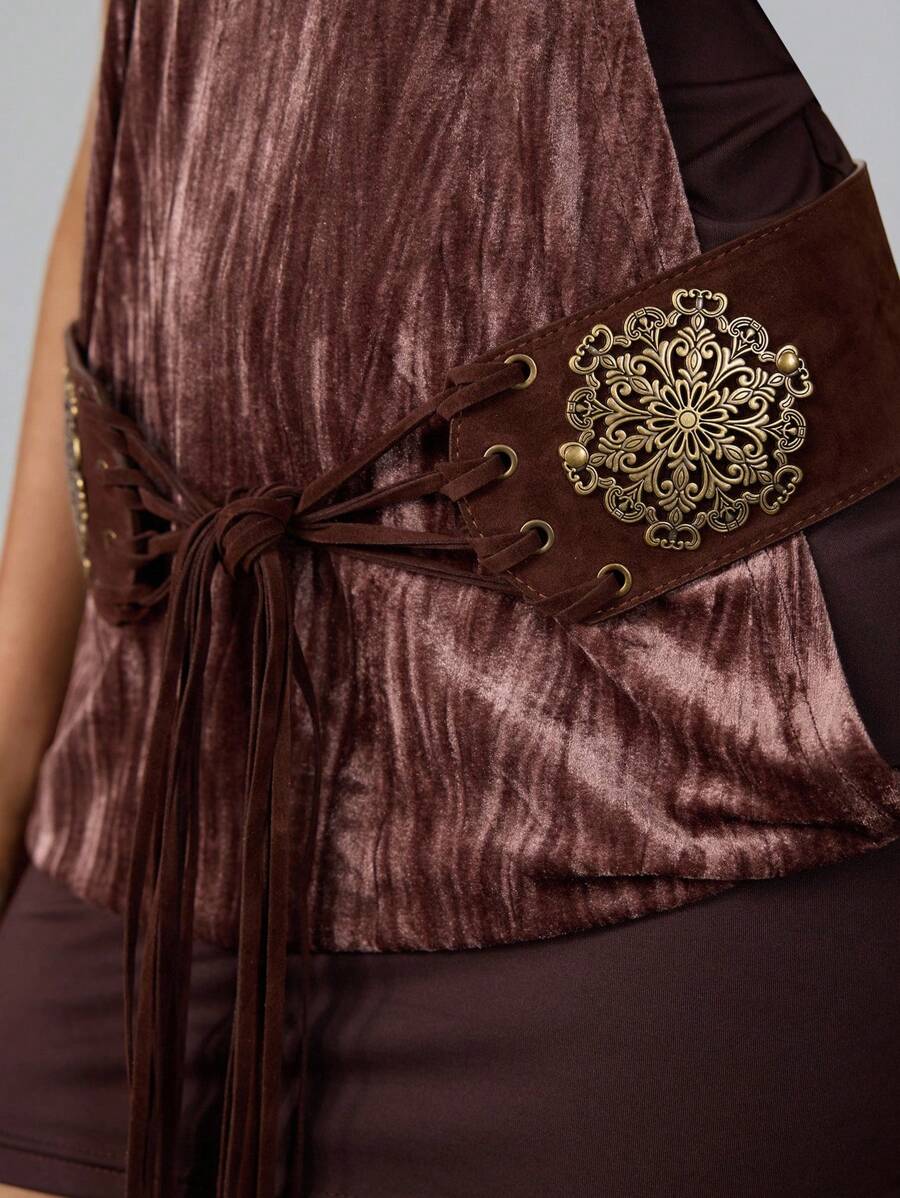Hippie قطعة واحدة حزام خصر جلدي بدون إبزيم بطراز عتيق بانك، لون بني به تفاصيل شراشيب والحدوات، طراز عصر الألفية الجديدة Y2K مزين بنقشات معدنية زهرية، إكسسوار ديكوري مخصص