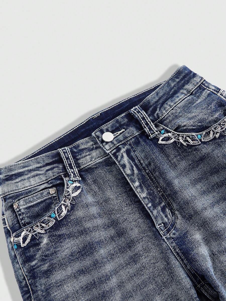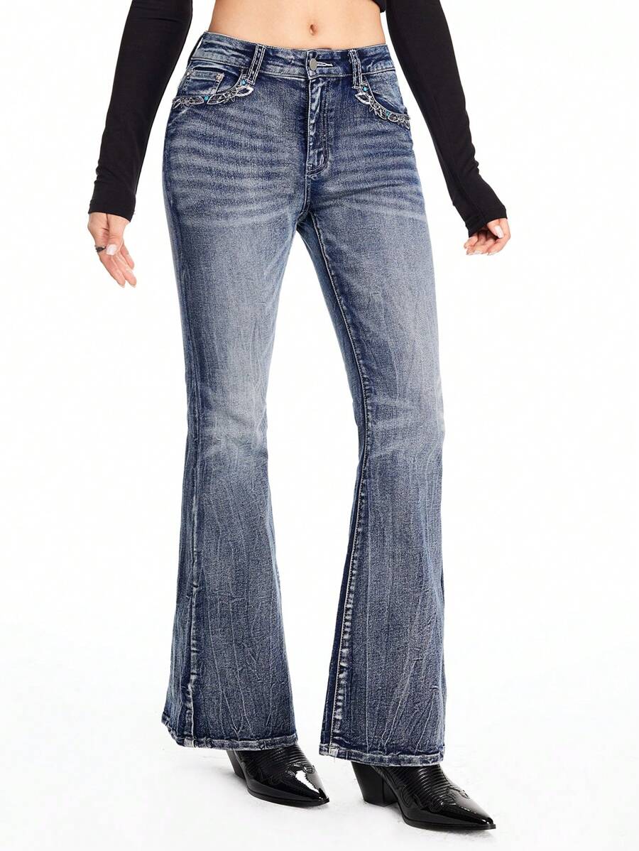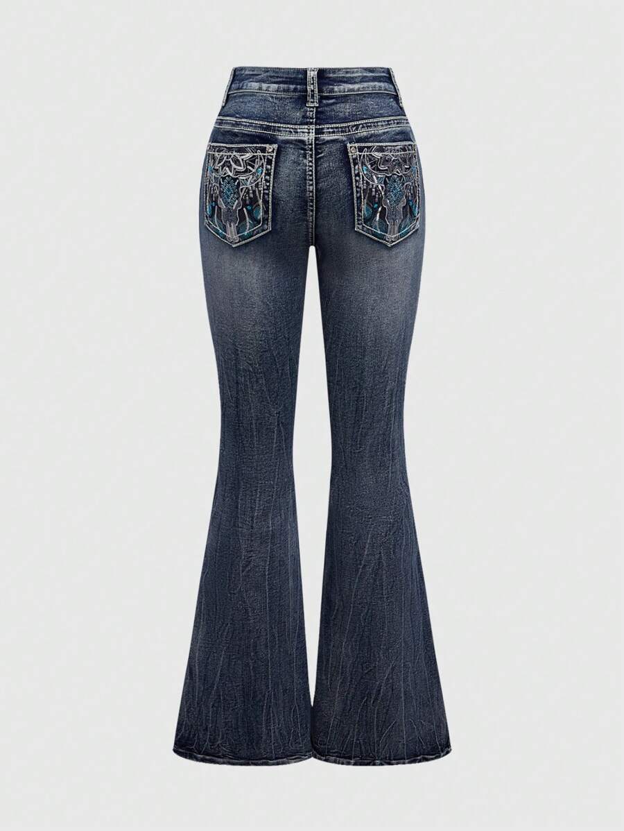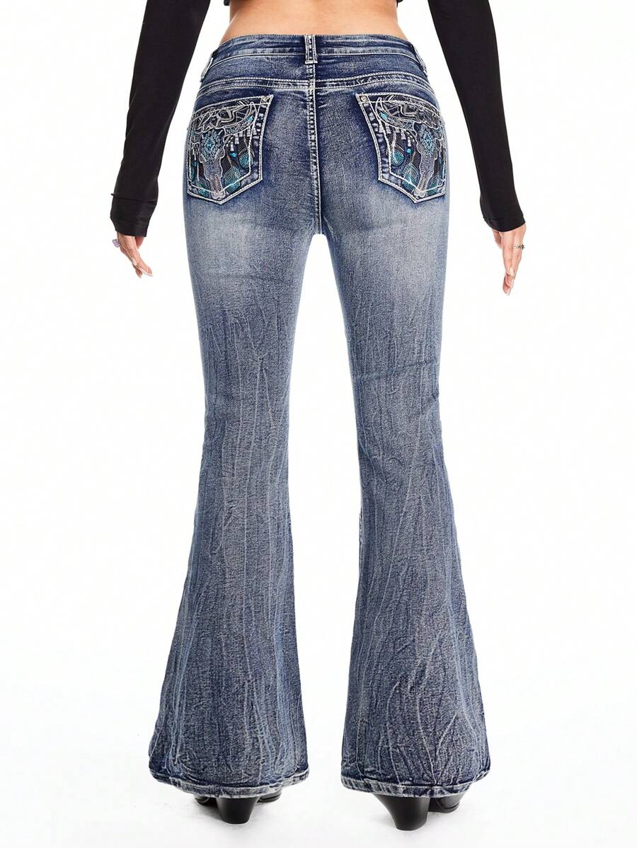 Hippie سراويل جينز نسائية ذات خصر منخفض بطراز بوهيمي مطرز على الطراز الكاوبوي، ريفي