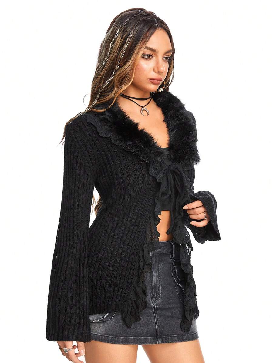 Hippie كارديجان محبوك بأكمام متفرعة مكسرة بتطريز الدانتيل للنساء