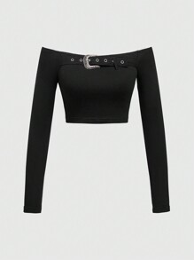 Hippie تي شيرت قصيرة ذات كتف مكشوف وأكمام طويلة لون أحادي مع تفاصيل ربطة، ربيع وصيف