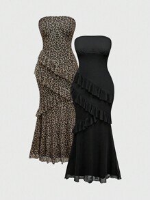 Hippie فستان فريد من نمط الفهد مطرز بالكشكشة بدون أكتاف مع مجموعة متعددة الاكسسوارات لنساء عصر Y2K، للاحتفال برأس السنة الجديدة