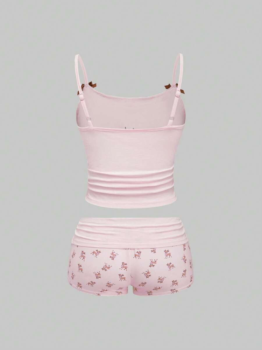J-Fashion بلوزة مطرزة بالدانتيل بشكل غزال مع شورت مطبوع بنقشة الغزال