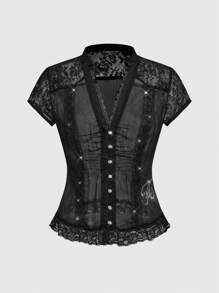 J-Fashion قميص أنيق أحادي الصدر قصير الأكمام نسائي مع تصميم تباين التطريز