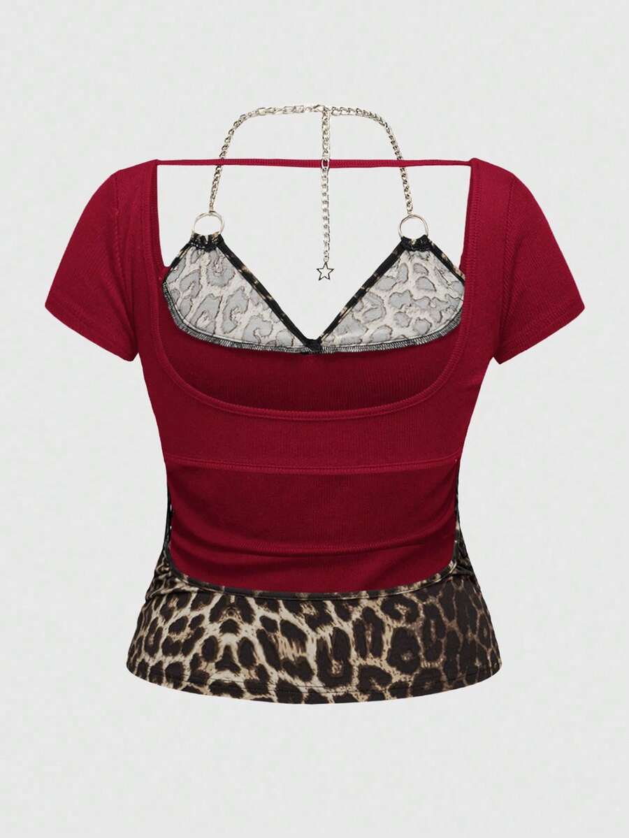 J-Fashion قميص من نساء ضيق المقطع أسفل الكتف بطبعة جلد النمر