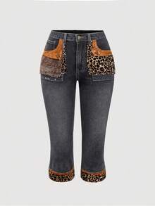 J-Fashion بنطلون كابري جينز ذو خصر منخفض مزخرف بقطع فرو الفهد الاصطناعي بطراز فينتاج Y2K