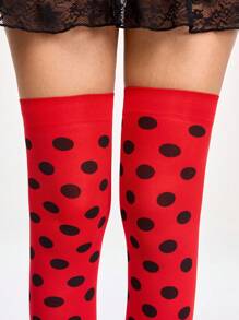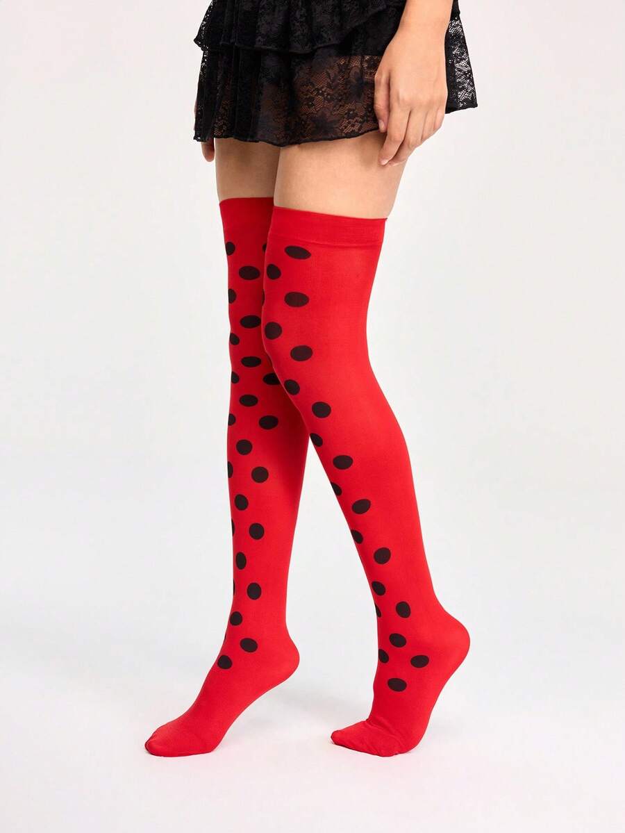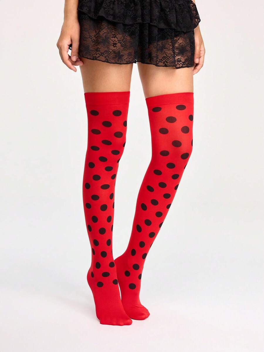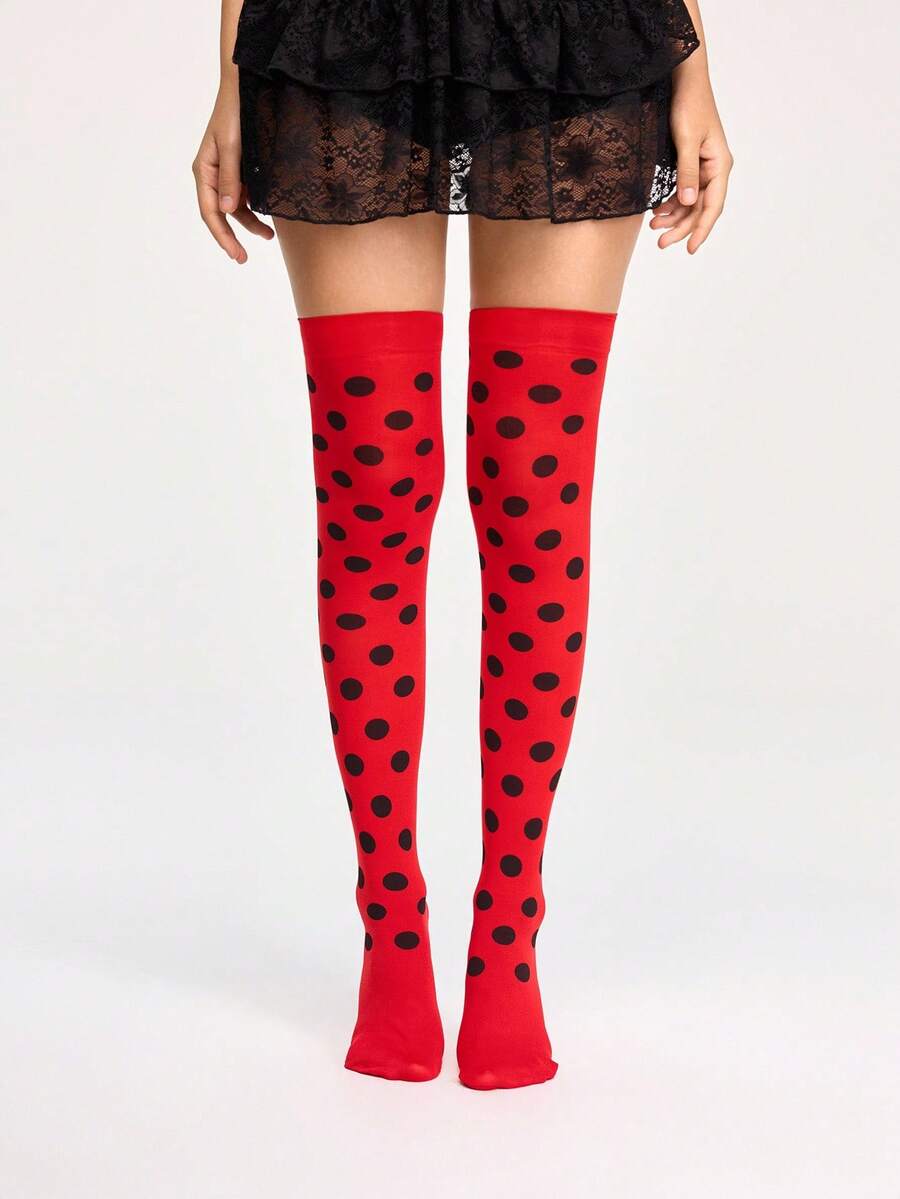 Kawaii زوج جوارب طويلة أنيقة باللون الأحمر مزينة برقع دائرية رومانسية وأنيقة للسيدات، مناسبة للتنسيق اليومي والتسوق ومهرجانات الموسيقى وغيرها