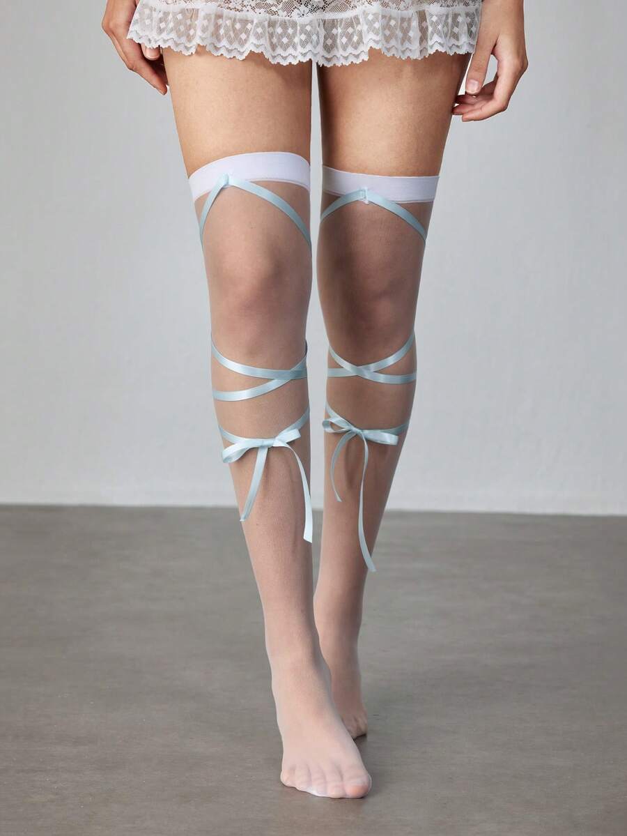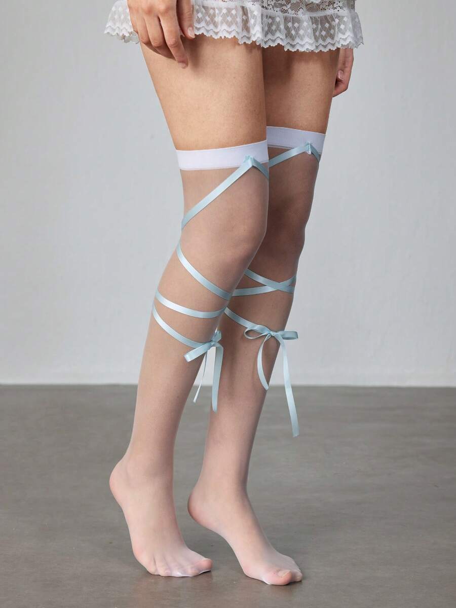 Kawaii زوج من جوارب طويلة رقيقة شفافة بيضاء مع ربطات شريط أزرق للنساء، مناسبة لجميع المواسم