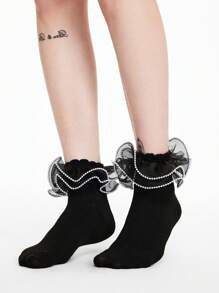 Kawaii الجوارب متوسطة الساق 1 زوج للنساء، من اللؤلؤ والارهاصات السوداء للاستخدام على مدار السنة