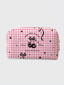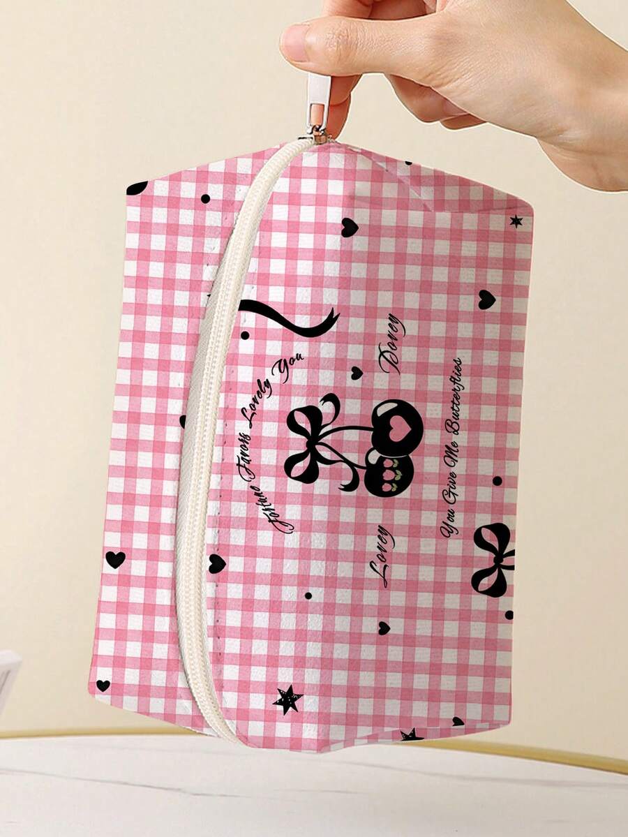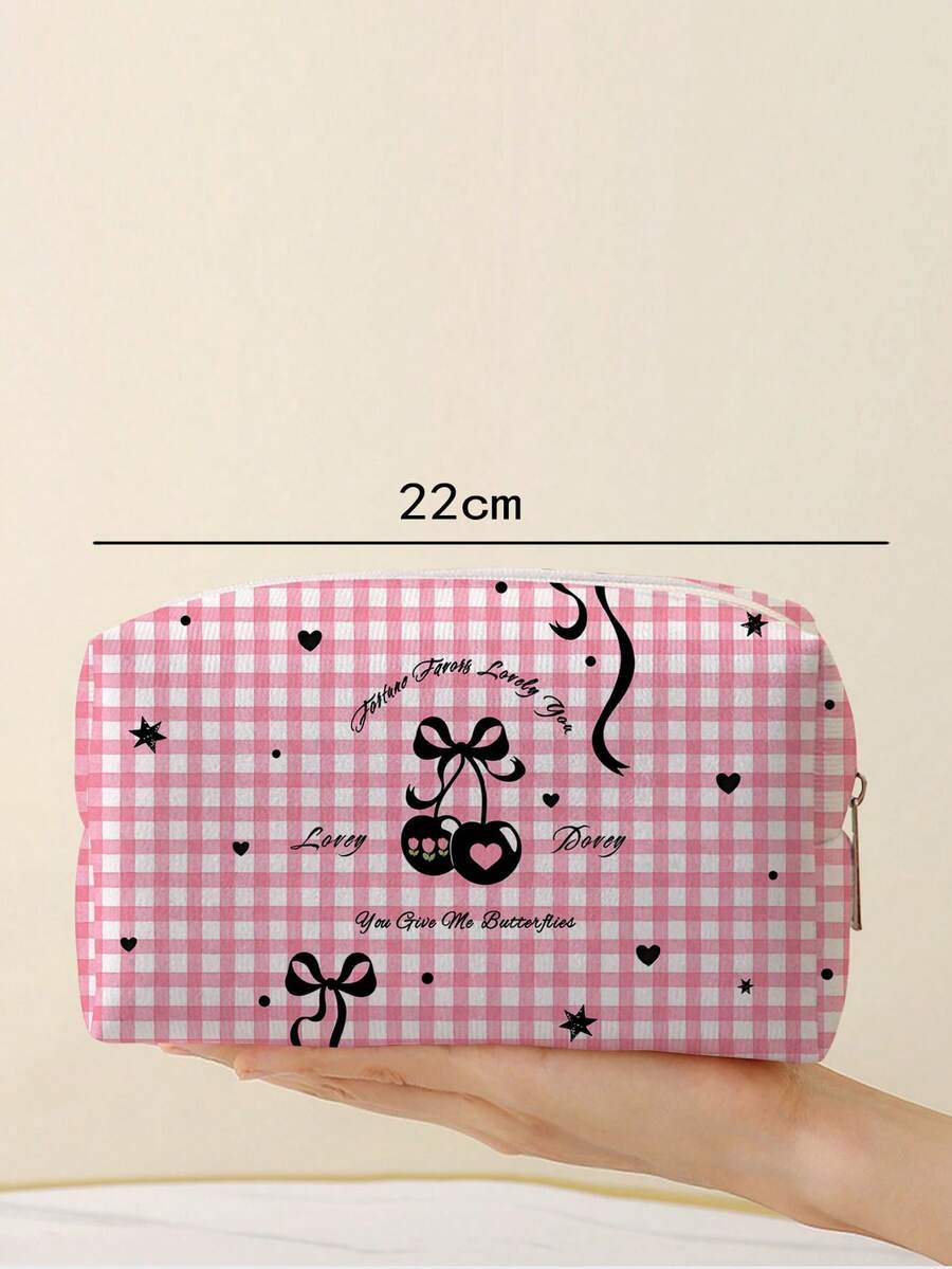 Kawaii حقيبة مستحضرات التجميل بسحاب ذات سعة كبيرة للنساء للسفر، قطعة واحدة، قلب كرزي، فيونكة، وردي منقوش، منظم عودة المدرسة (موقع الطباعة عشوائي)