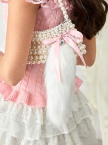 Kawaii قطعة واحدة ذيل بنفشي فاخر بريشة بيضاء أنيقة ودلوعة مع فيونكة وردية منتسوق المفاتيح والمودعات ، للفتيات/السيدات ، مناسب كاكسسوار يومي وهدية عطلة