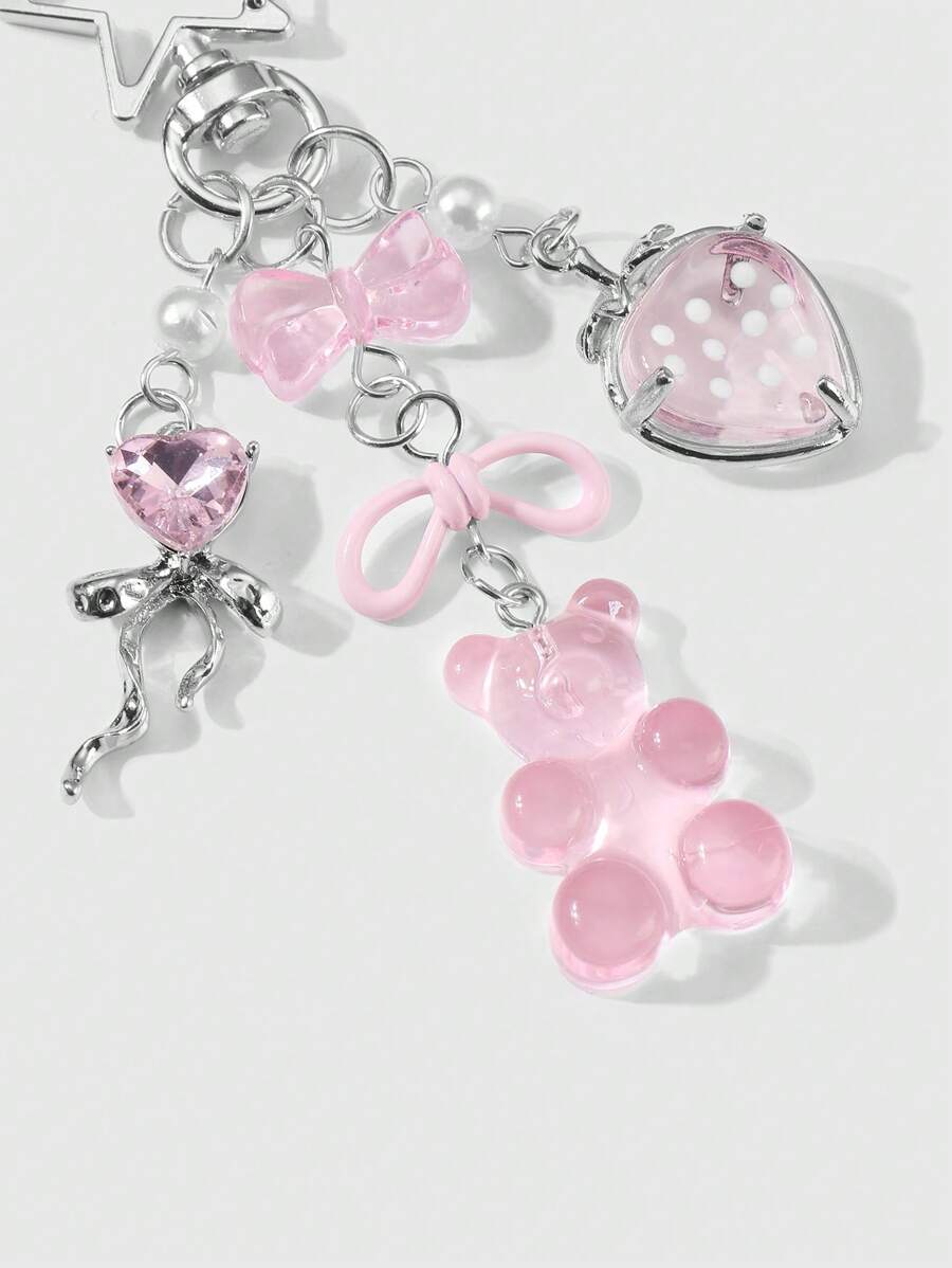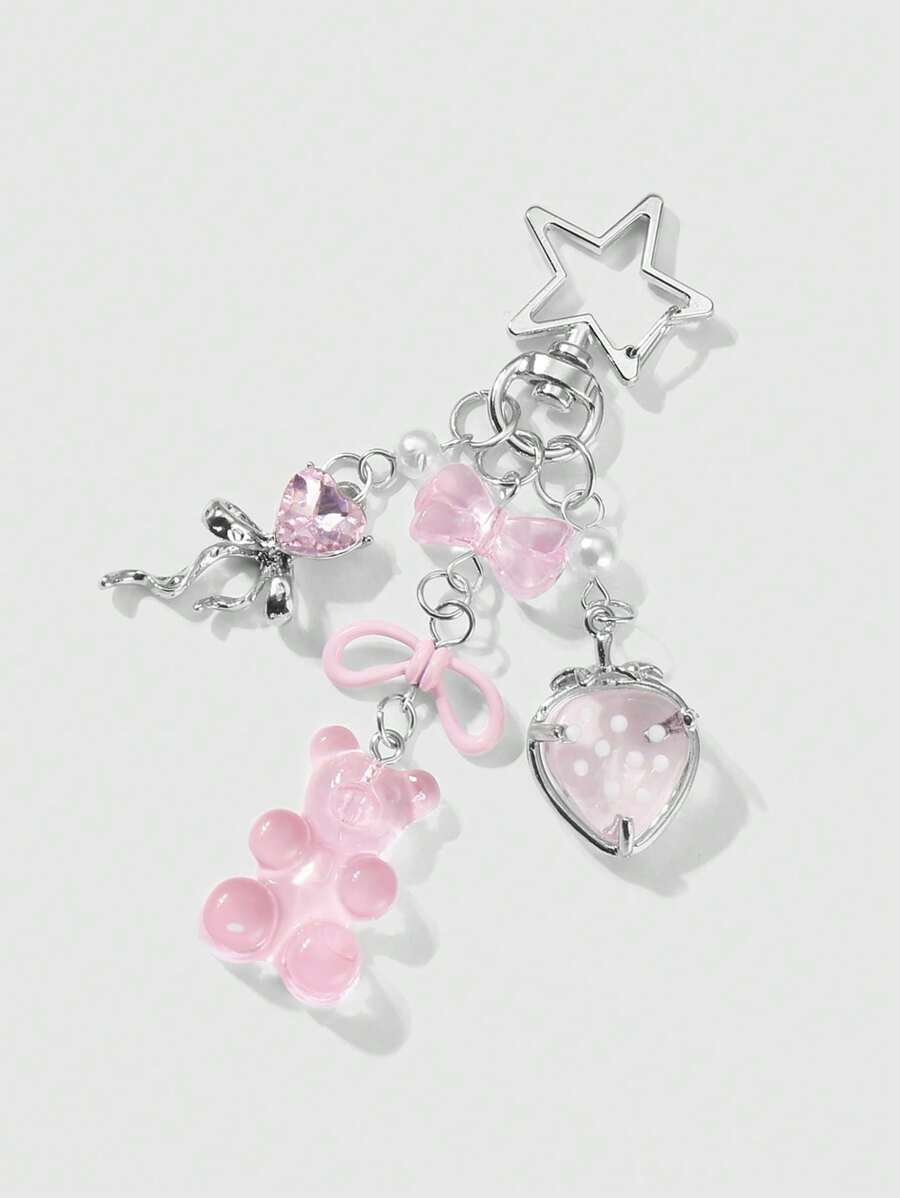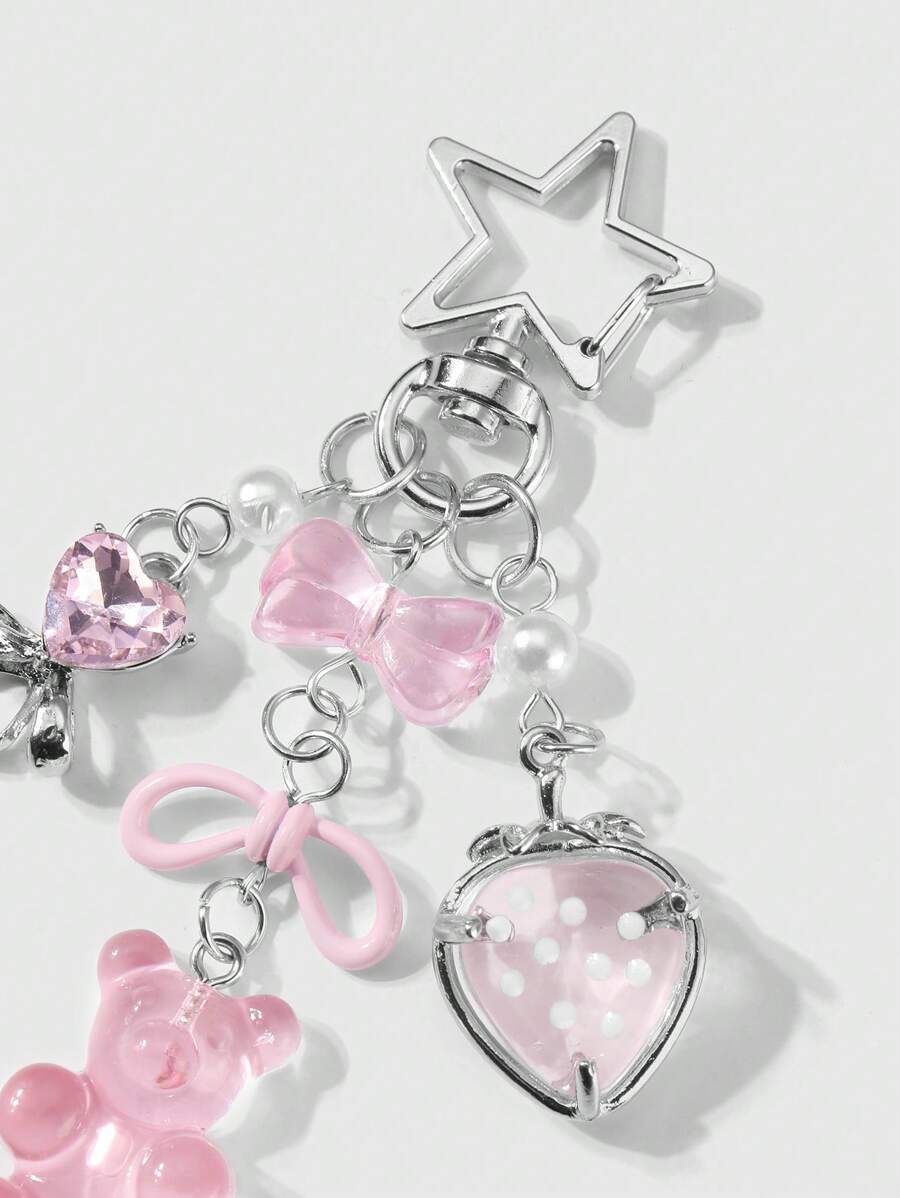 Kawaii 1 قطعة سلسلة مفاتيح على شكل زهرة النجمة قلب فراشة دب فراولة إنيق فخم فضي مرصع باللؤلؤ والكريستال ، مناسب للنساء والفتيات للاستخدام اليومي ، هدية للمناسبات