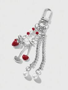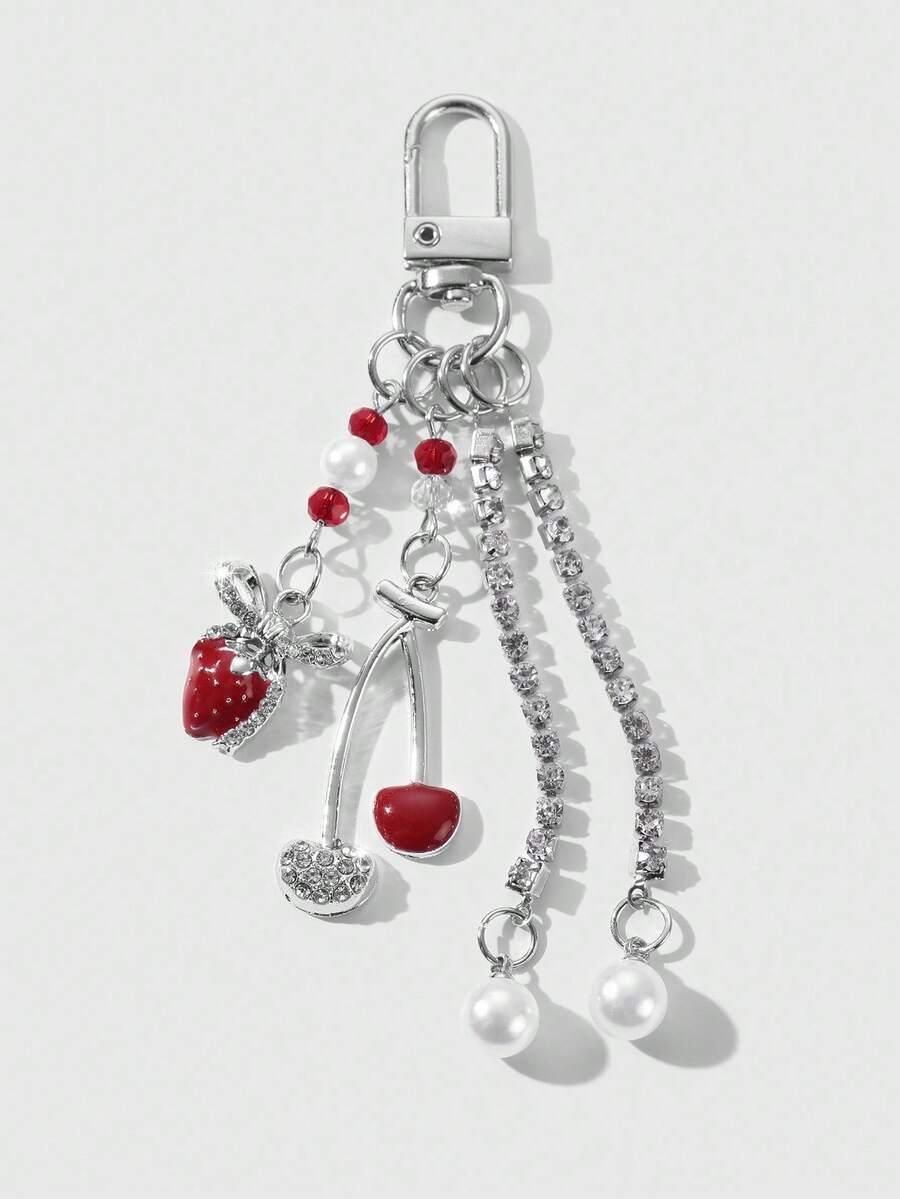 Kawaii 1 قطعة سلسلة مرصعة بالراين فاخرة وأنيقة، زخرفة من اللؤلؤ الاصطناعي والكرز والفراولة، سلسلة مفاتيح وتعليقة للحقيبة مناسبة للنساء، للاستخدام اليومي أو كهدية