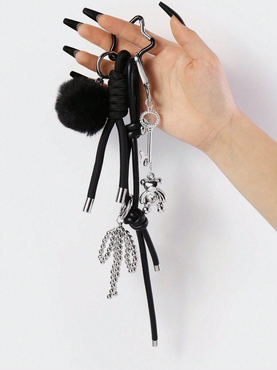 Kawaii قطعة واحدة من الزينة المفتاح القابل للتعديل من الجلد ذات العقدة المصنوعة يدويًا، القلب، الدب، كرة فرو، بسبك فضي على الطراز الجوتي للنساء والفتيات، فكرة هدية رائعة