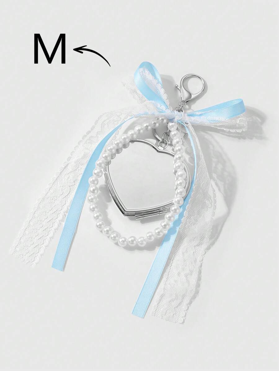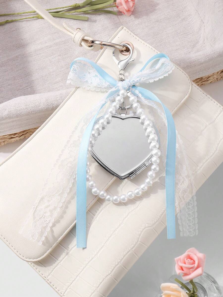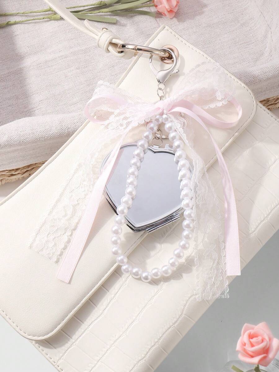 Kawaii قلادة مفتاح خرزية منسوجة من الخيوط مرآة الجانب بشكل قلب شيطاني، فاخرة بنوع اللؤلؤ الأبيض المزيف ، عقدة الفراشة من التول، مناسبة للنساء والفتيات للاستخدام اليومي أو كهدية للمناسبات