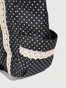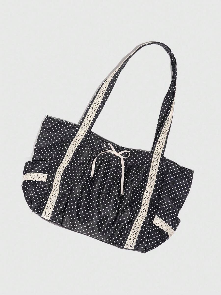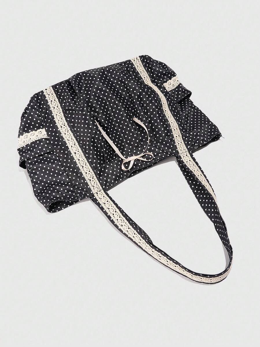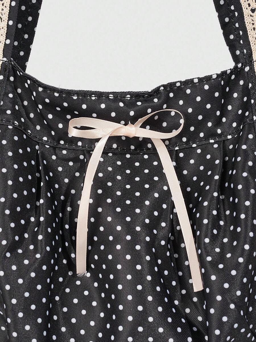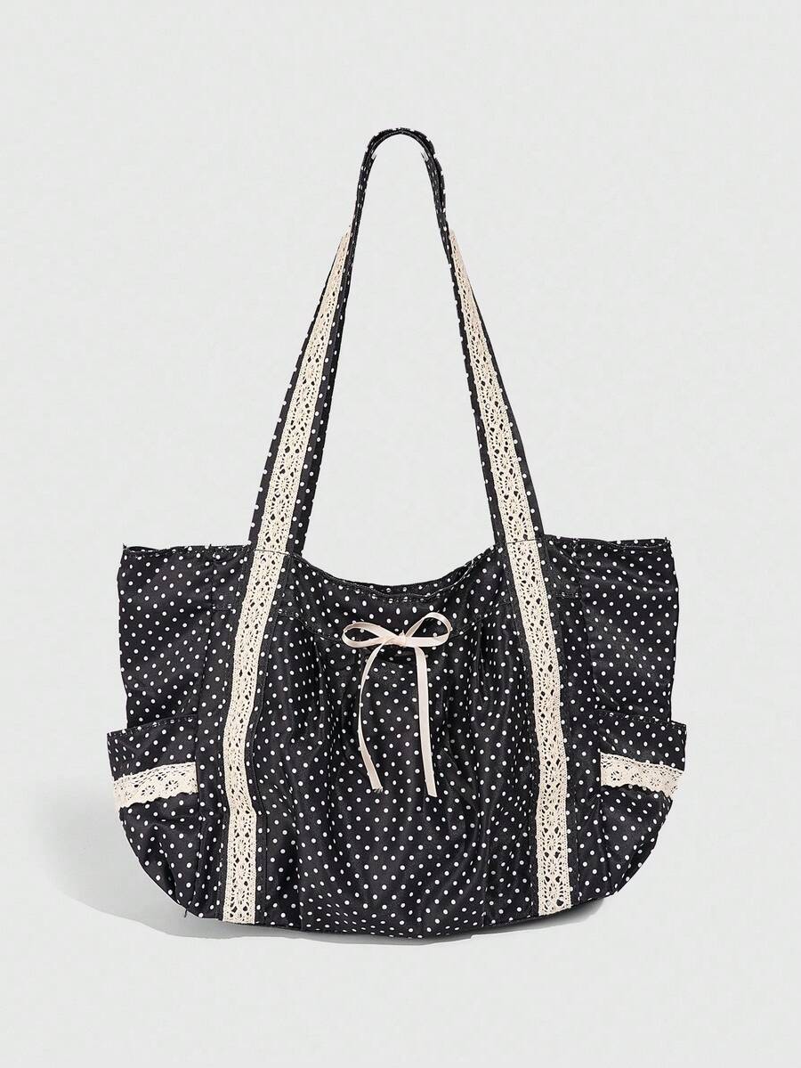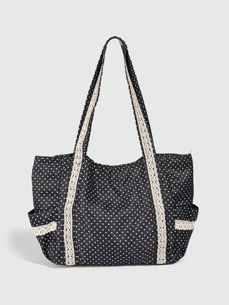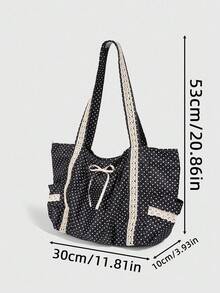Kawaii حقيبة كتف كانفاس بنمط نقاط بيضاء وسوداء على الطراز الكوري بسعة كبيرة، حقيبة تسوق عملية وأنيقة، حقيبة فتاة رقيقة