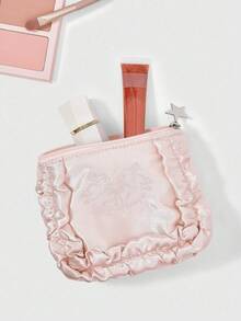 Kawaii حقيبة مكياج وردية ذات تصميم فريد متعددة الأقسام، مزينة بالتطريز والفيونكة والخرز الصناعي والدانتيل، تستوعب الفوط الصحية والعملات والمناديل - هدية للأم