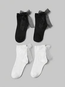 Kawaii زوجان من الجوارب متوسطة الطول المزينة بفيونكة، جوارب موحد اللون مع تريم من التطريز، طراز JK للنساء