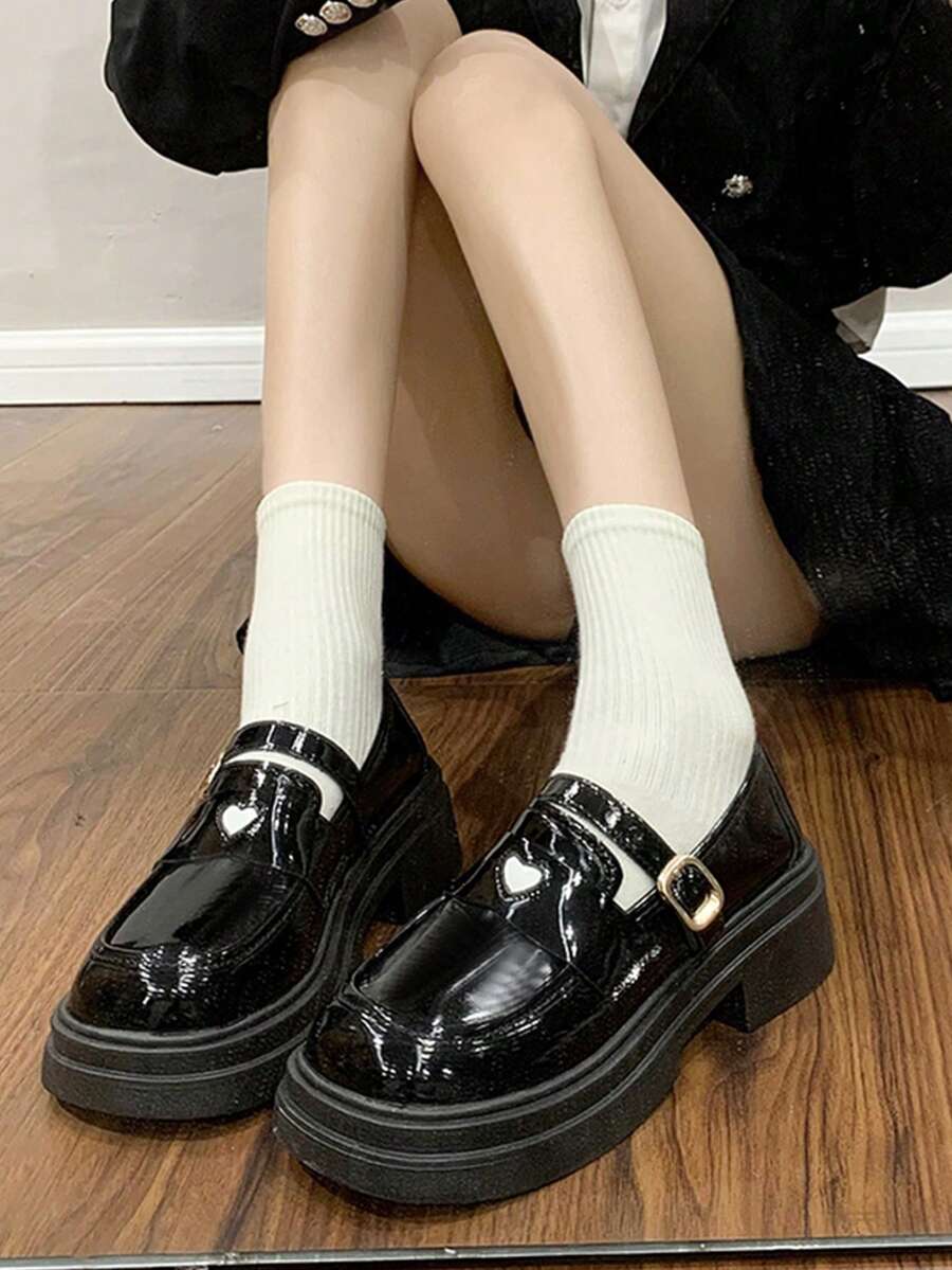 Kawaii حذاء جين نسائي جديد سميك على منصة بطابع ياباني خريفي/ربيعي 2023، نمط قلب الحب باللون الوردي المناسب للفساتين والتنانير