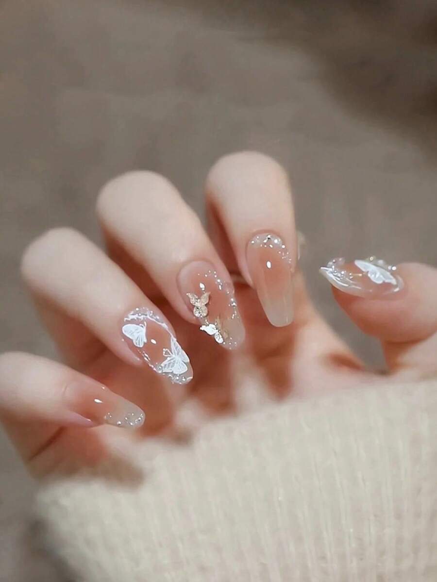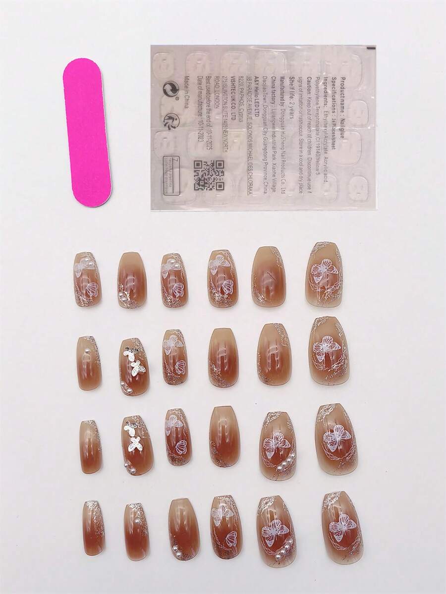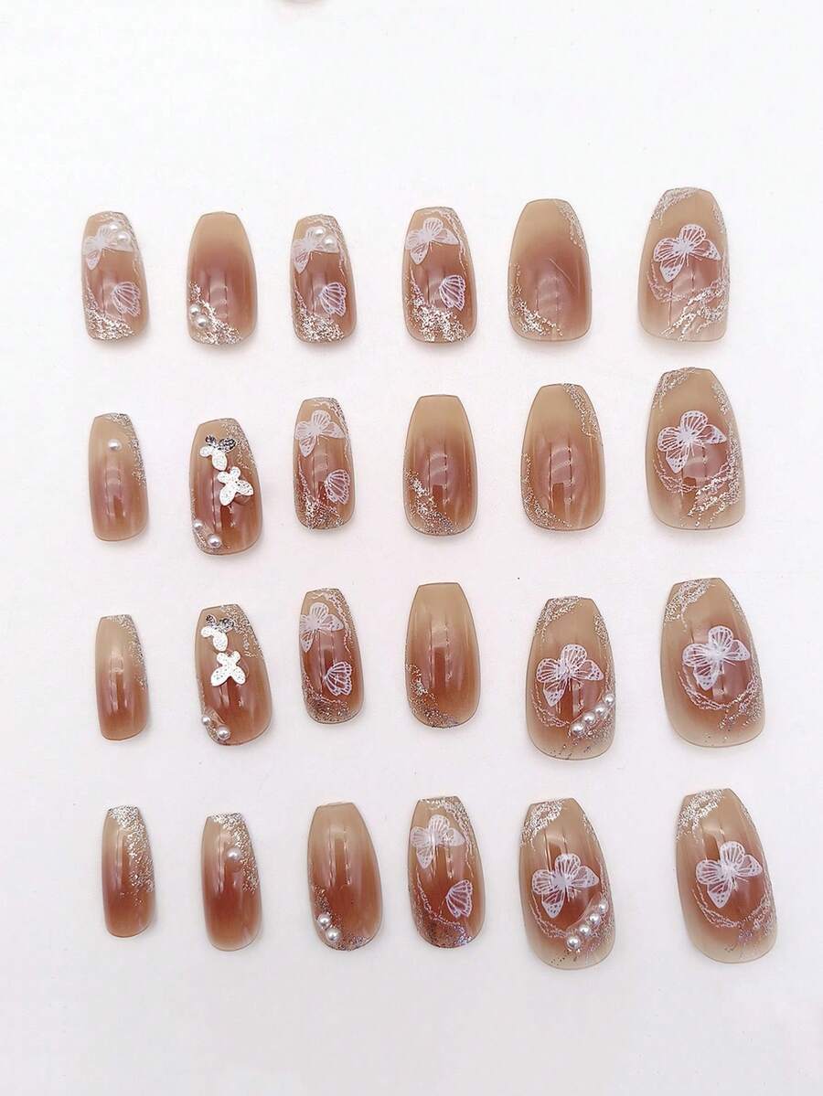 Kawaii ٢٤ نصف قطعة أظافر مزيفة طويلة بطبعة الفراشة وزينة مزيفة من اللؤلؤ تغطي قاعدة الأظافر بالكامل للنساء والأطفال البنات