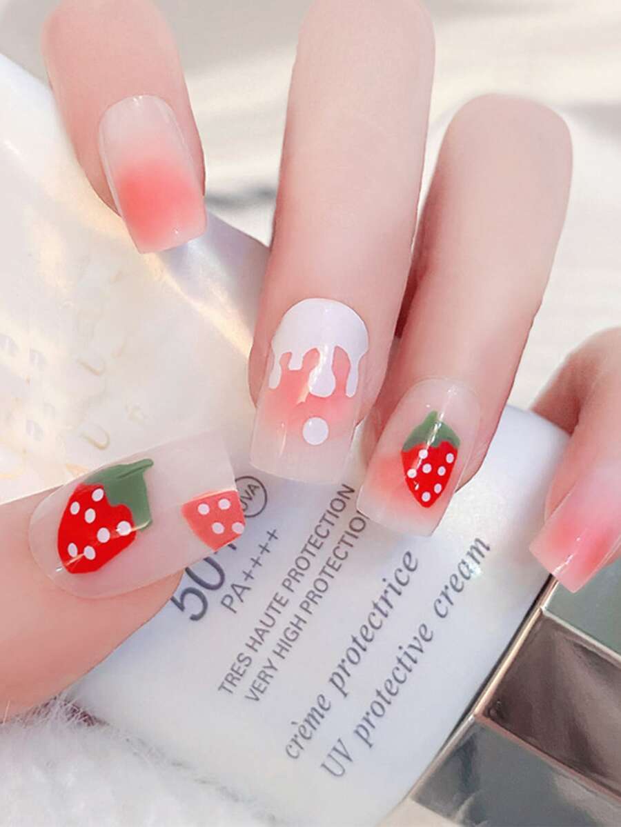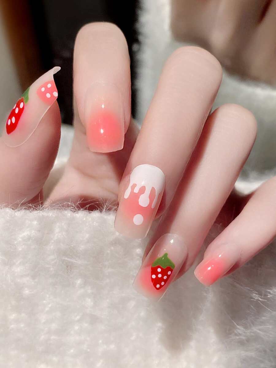 Kawaii 24 قطعة بطباعة فراولة أظافر اصطناعية مع ورقة واحدة شريط