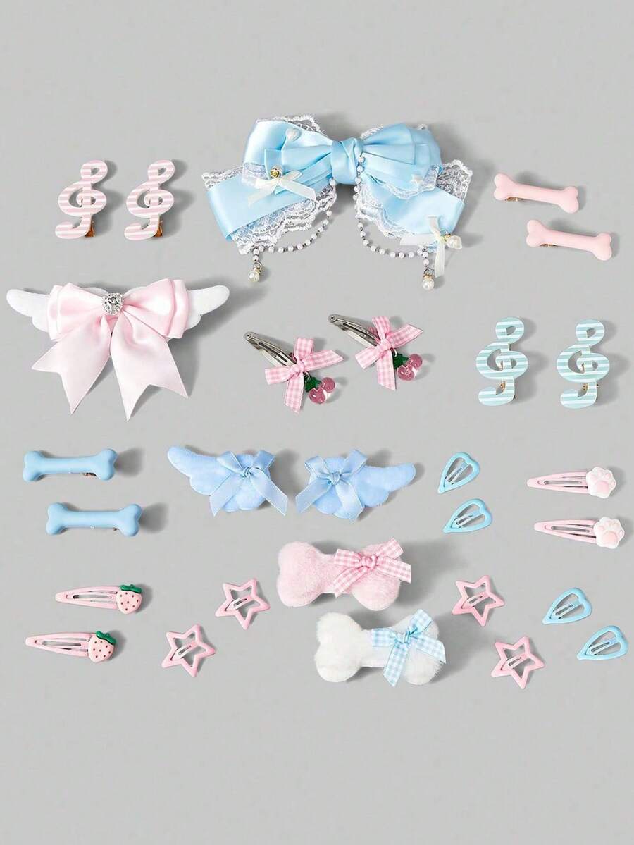 Kawaii 28 أنماط عشوائية من دبابيس الشعر الصغيرة الجميلة باللونين الوردي والأزرق، مصنوعة يدويًا بتصاميم الأجنحة والنجوم والفيونكات والفراولة والكرز وعناصر الملاحظات الموسيقية