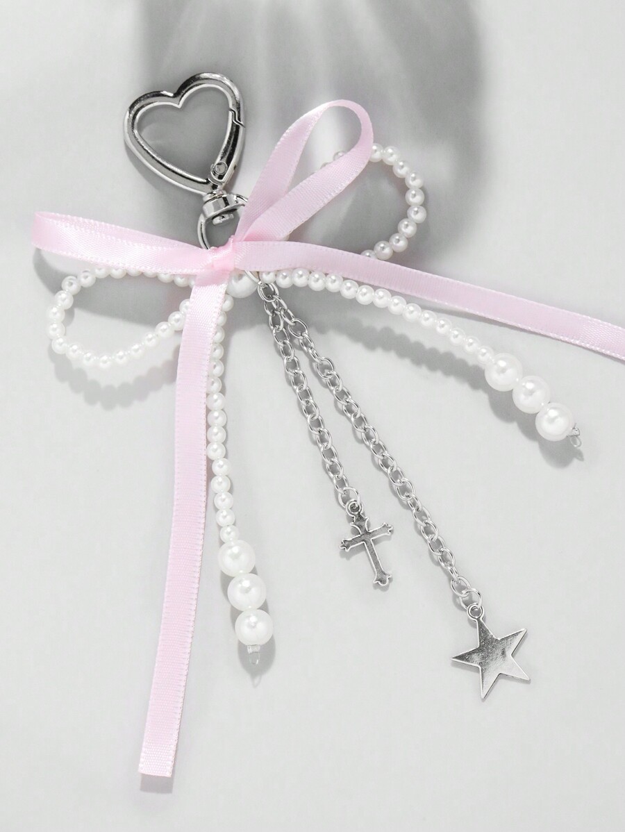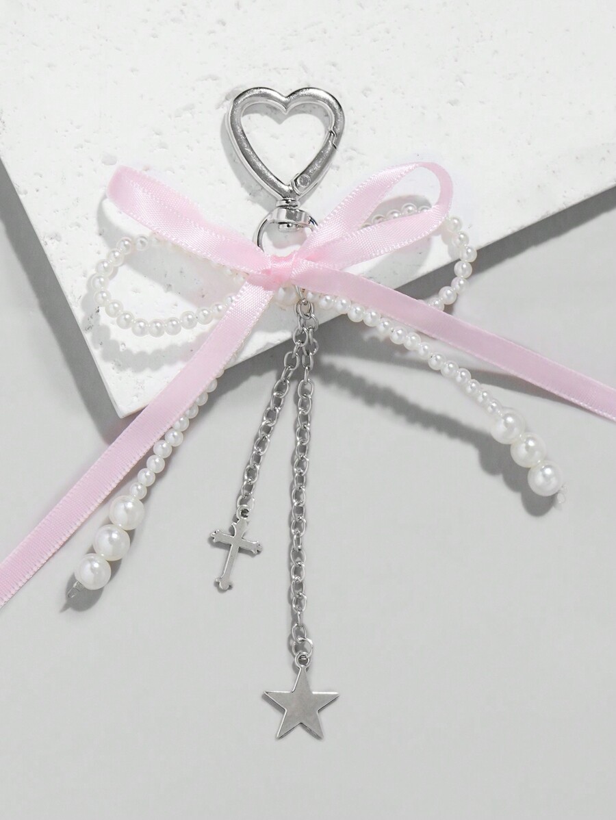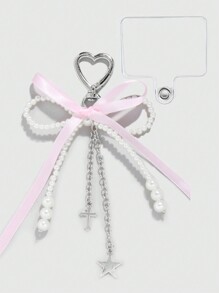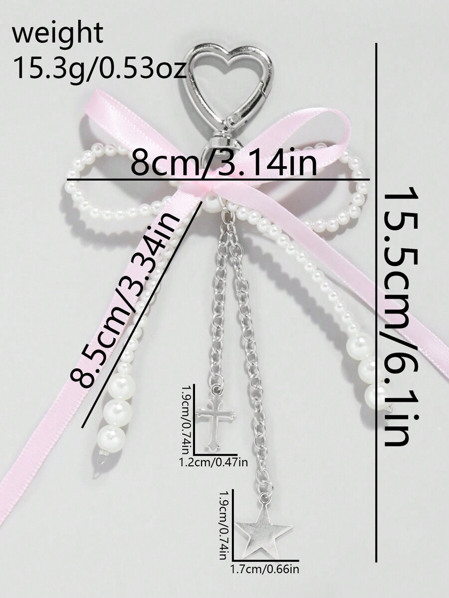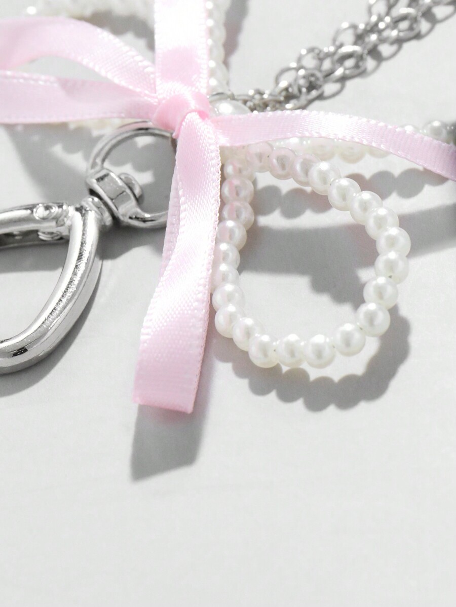 Kawaii 2 قطعة/مجموعة من الكوريين الرقيقة وعالية الجودة مصنوعة يدويًا من خرز وشذرات باللون الأبيض المحاكي للؤلؤ الوردي والأقواس الشريطية والنجوم الفضية، مجموعة قلادة وسير الهاتف ومعلق الحقيبة مع مشبك مضاد للفقدان، مناسبة للنساء والفتيات والاستخدام اليومي والهدايا